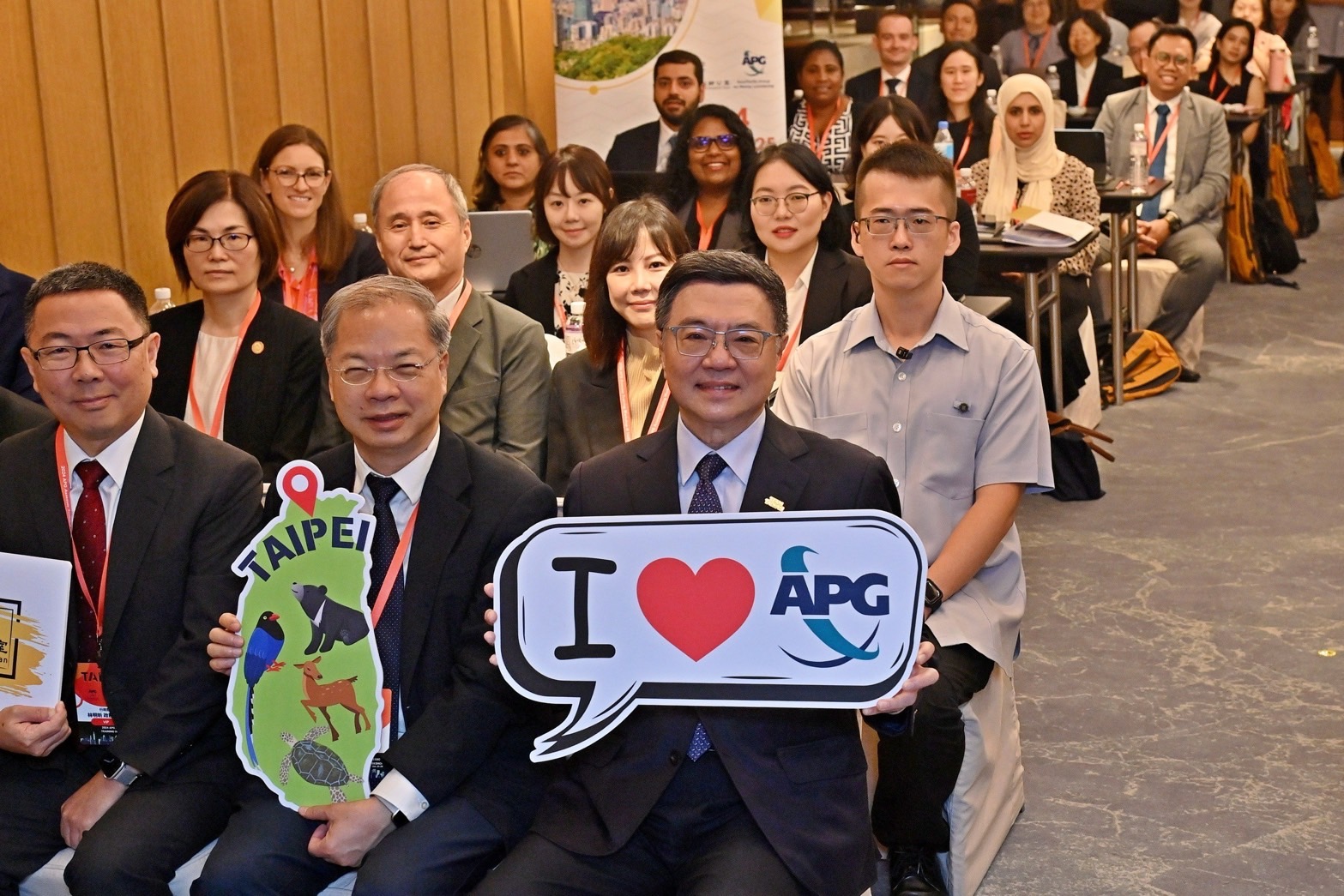 致詞結束後,卓院長致贈禮品予本次研討會7位講師,隨後持「I love APG」手拿板,與行政院林明昕政務委員、龔明鑫秘書長、李慧芝發言人、法務部鄭銘謙部長、金融監督管理委員會彭金隆主任委員、外交部國際組織司李冠德副司長、法務部調查局吳以公副局長、洗錢防制處吳月萍處長、亞太防制洗錢組織(APG)David Shannon副秘書長,以及現場所有貴賓於座位上大合影留念。