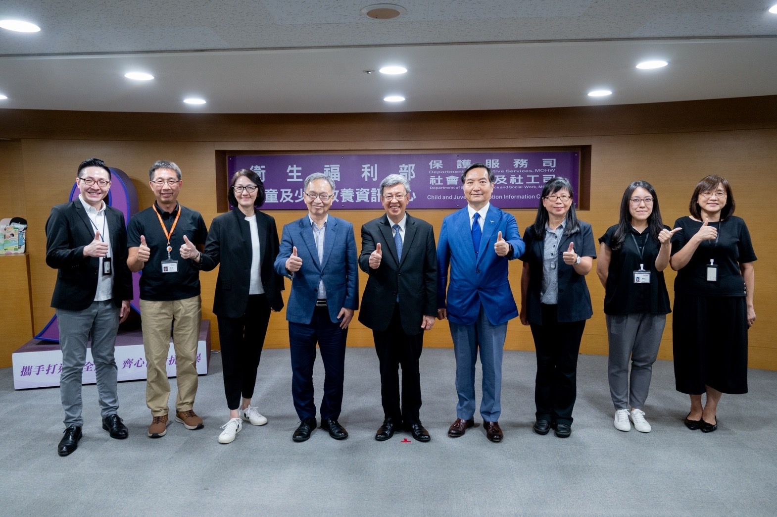 陳院長表示,政府對於性騷擾防治的態度就是「性騷擾零容忍」,請大家持續朝此目標共同努力,建立一個杜絕性騷擾及性別暴力的和諧社會。此行,陳院長首先聽取衛福部保護服務司張秀鴛司長簡報「113保護專線工作概況」,了解該專線設置緣由、服務特色及執行現況,並於致詞結束後,視察113保護專線接線中心,實地了解該專線運作現況及接線情形。最後,陳院長並與行政院羅秉成政務委員、衛福部薛瑞元部長、行政院性別平等處吳秀貞處長、113保護專線接線中心黃傑凱主任及台灣世界展望會李紹齡會長等人合影留念。