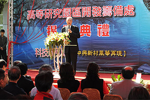 行政院長吳敦義今(21)日出席南投中興新村的高等研究園區開發籌備處揭牌典禮時表示,南投遭受九二一大地震重創及省政府虛級化長遠影響,失業率及自殺率較高,此次南投高等研究園區的進駐,秉持馬總統指示「先建後遷」、「先進後出」的原則,藉由產業研發部門、政府部門及高學歷人士的進駐,期待中興新村能風華再現。