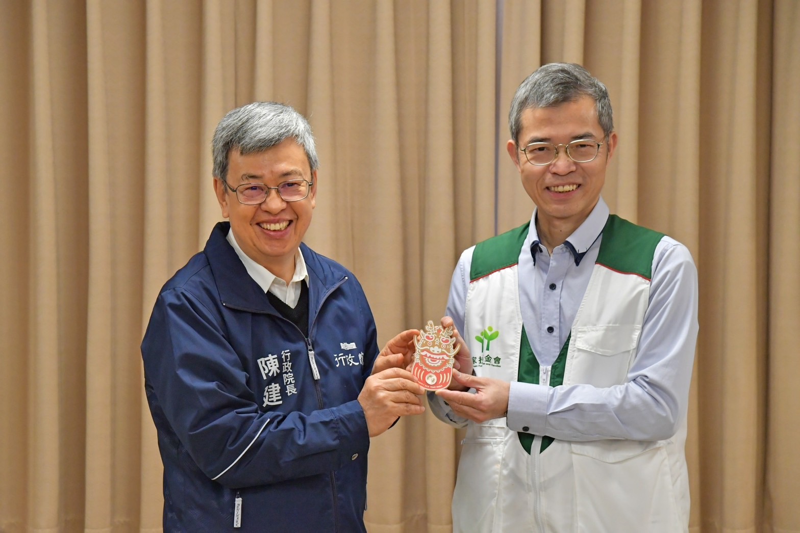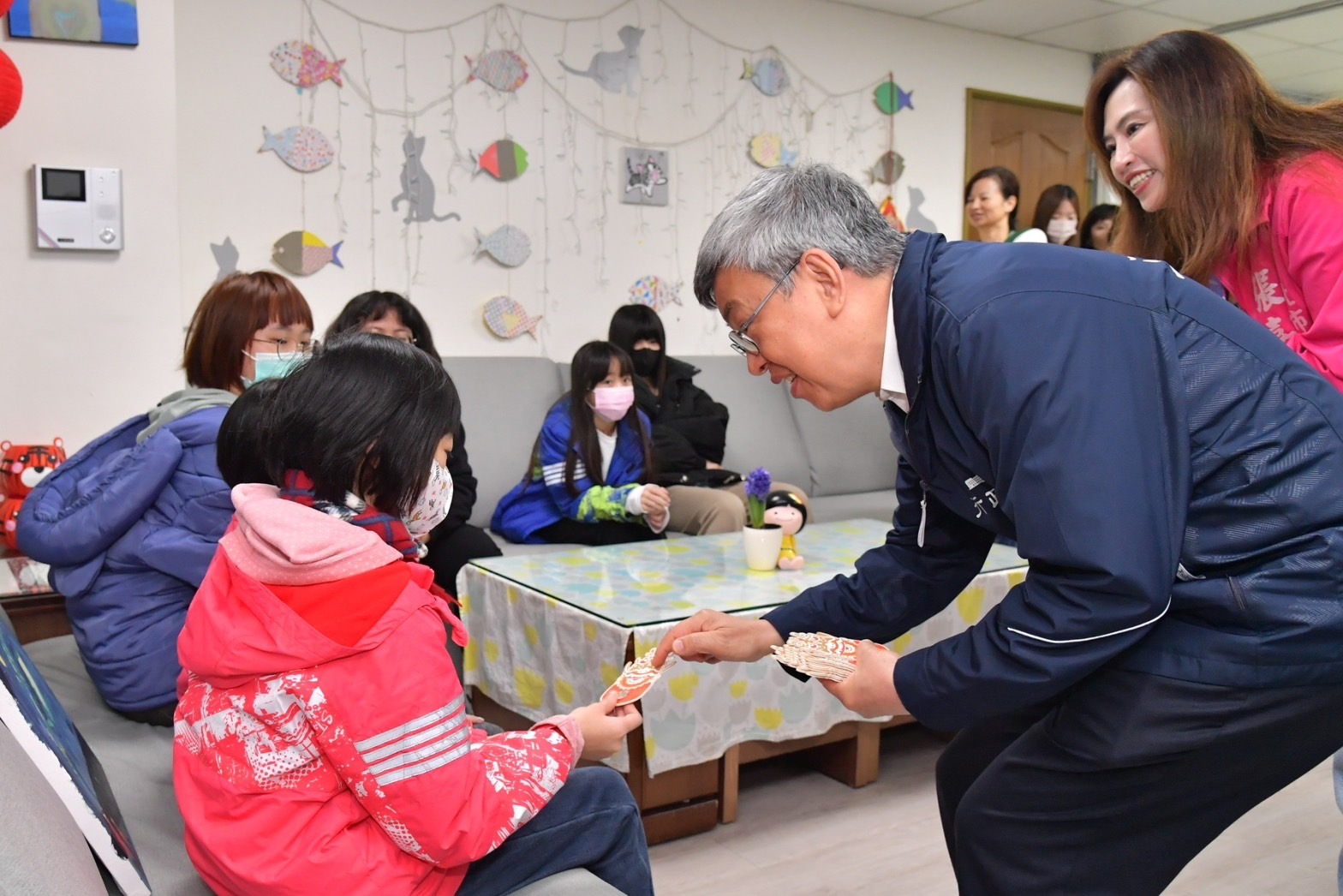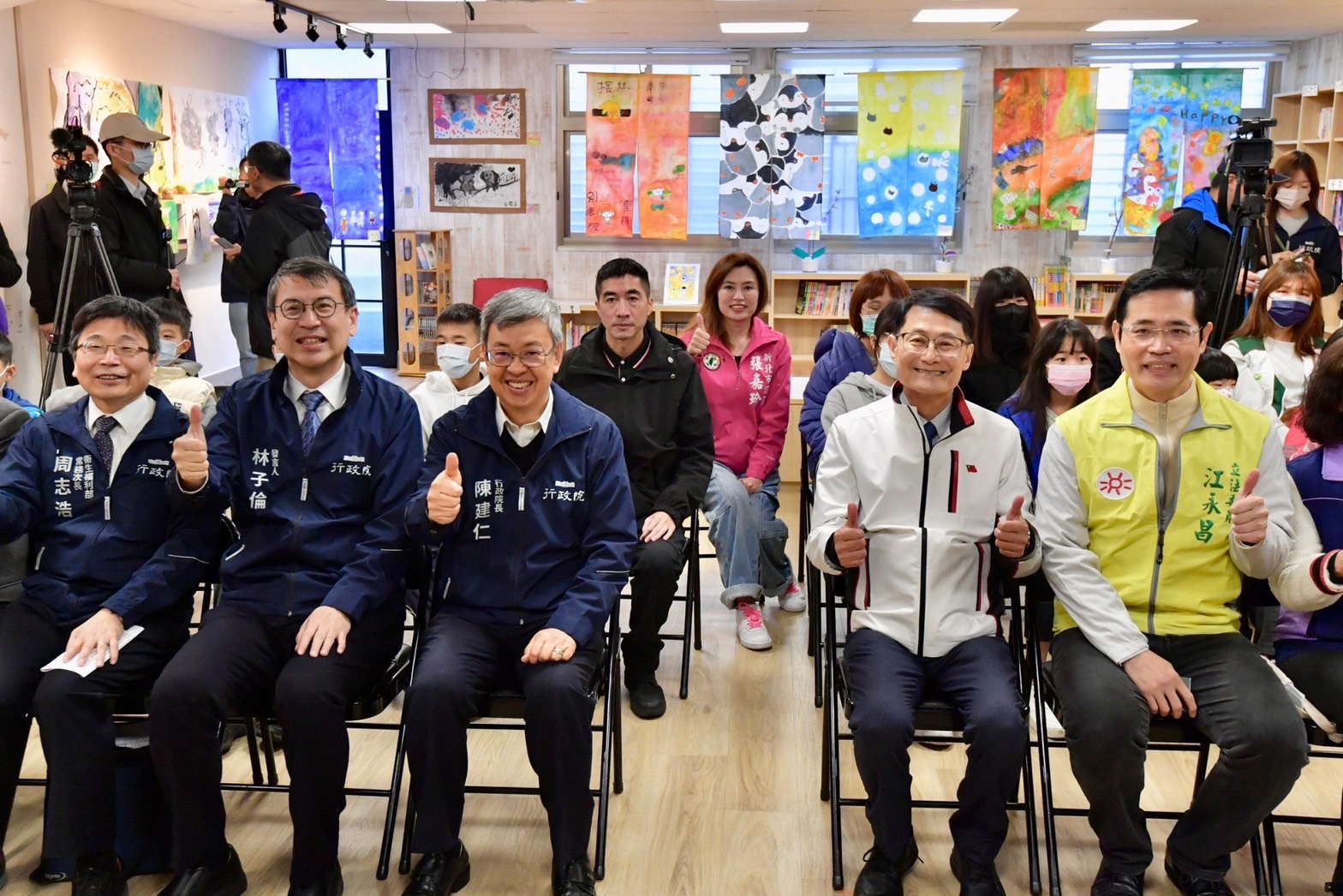 陳院長抵達後,首先於座位區與行政院林子倫發言人、衛生福利部周志浩次長、社會及家庭署周道君副署長、新北市陳純敬副市長、新北市政府社會局許秀能副局長、江永昌立委、新北市張維倩市議員、張嘉玲市議員、大同育幼院黃劍峯院長、育幼院工作同仁及院童合影留念,隨後聽取黃劍峯院長簡介大同育幼院歷史沿革及觀賞該育幼院70周年影片;致詞結束後,院長致贈加菜金及龍年賀歲福袋予黃劍峯院長,並參觀多功能運動館、扶幼館小家(恩慈家),由院童介紹寢室、書房等生活空間,院長也發龍年福袋祝福院童新年快樂,院童則回贈院長一幅「夜空中的鯨魚」畫作,並一同開心合影留念。