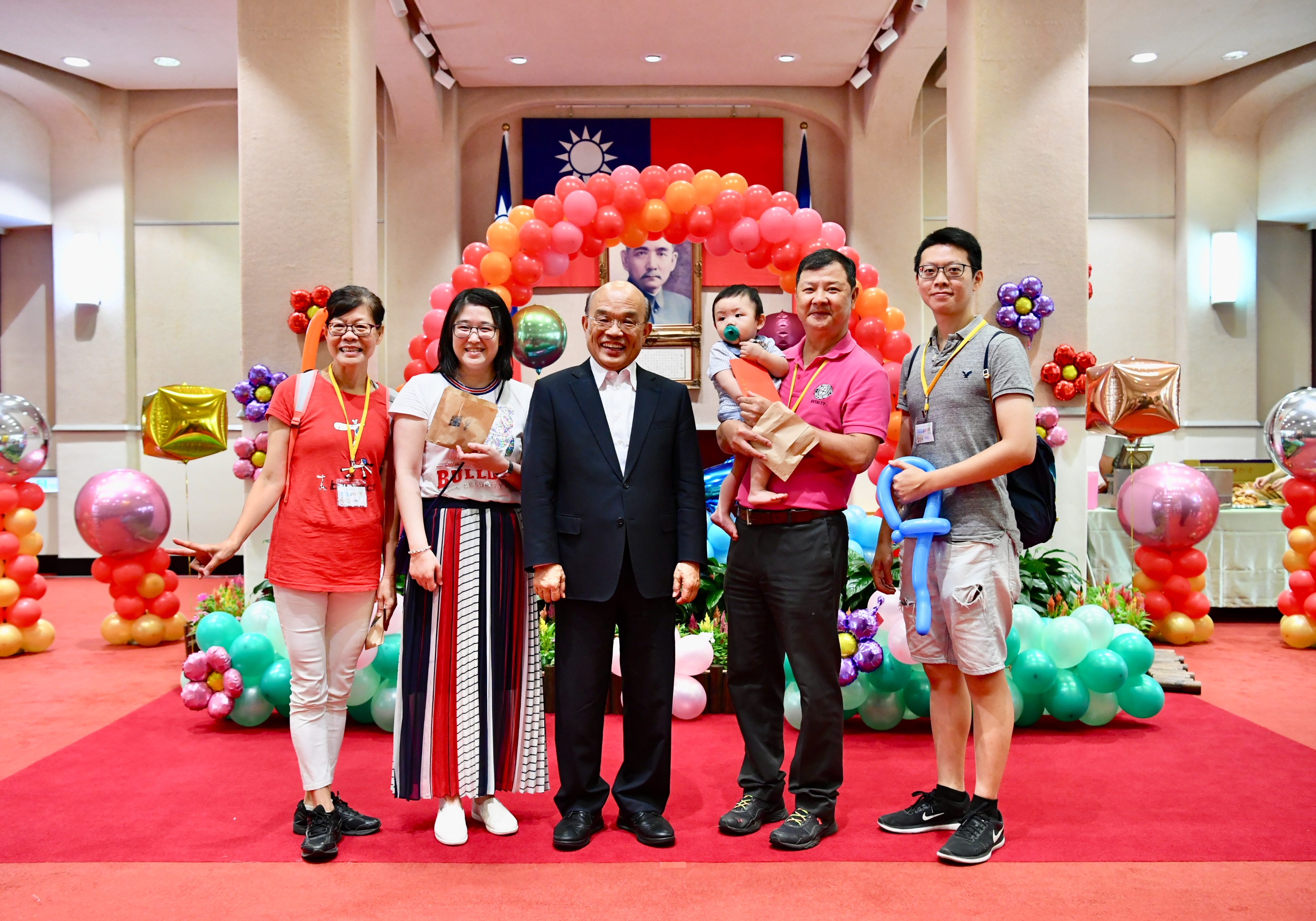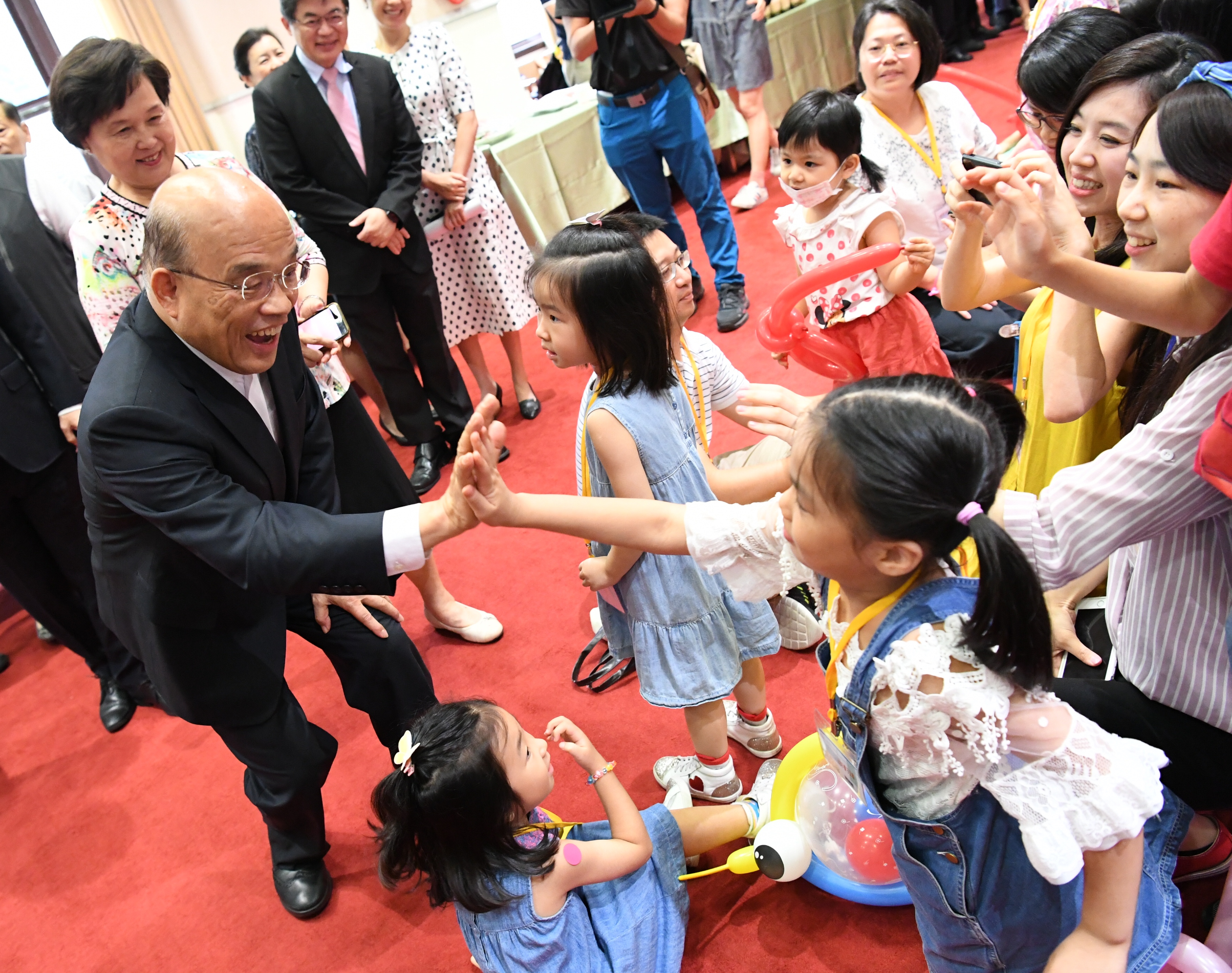行政院長蘇貞昌今(16)日出席行政院108年親子日活動,受到大朋友小朋友熱情歡迎,有人大喊「蘇阿北好」,還有人稱呼「蘇伯伯好」,甚至跑上前向院長擊掌、討抱,畫面相當溫馨熱鬧。為了鼓勵「敢婚、願生、樂養」,院長特別爭取加碼發送生育獎勵金。