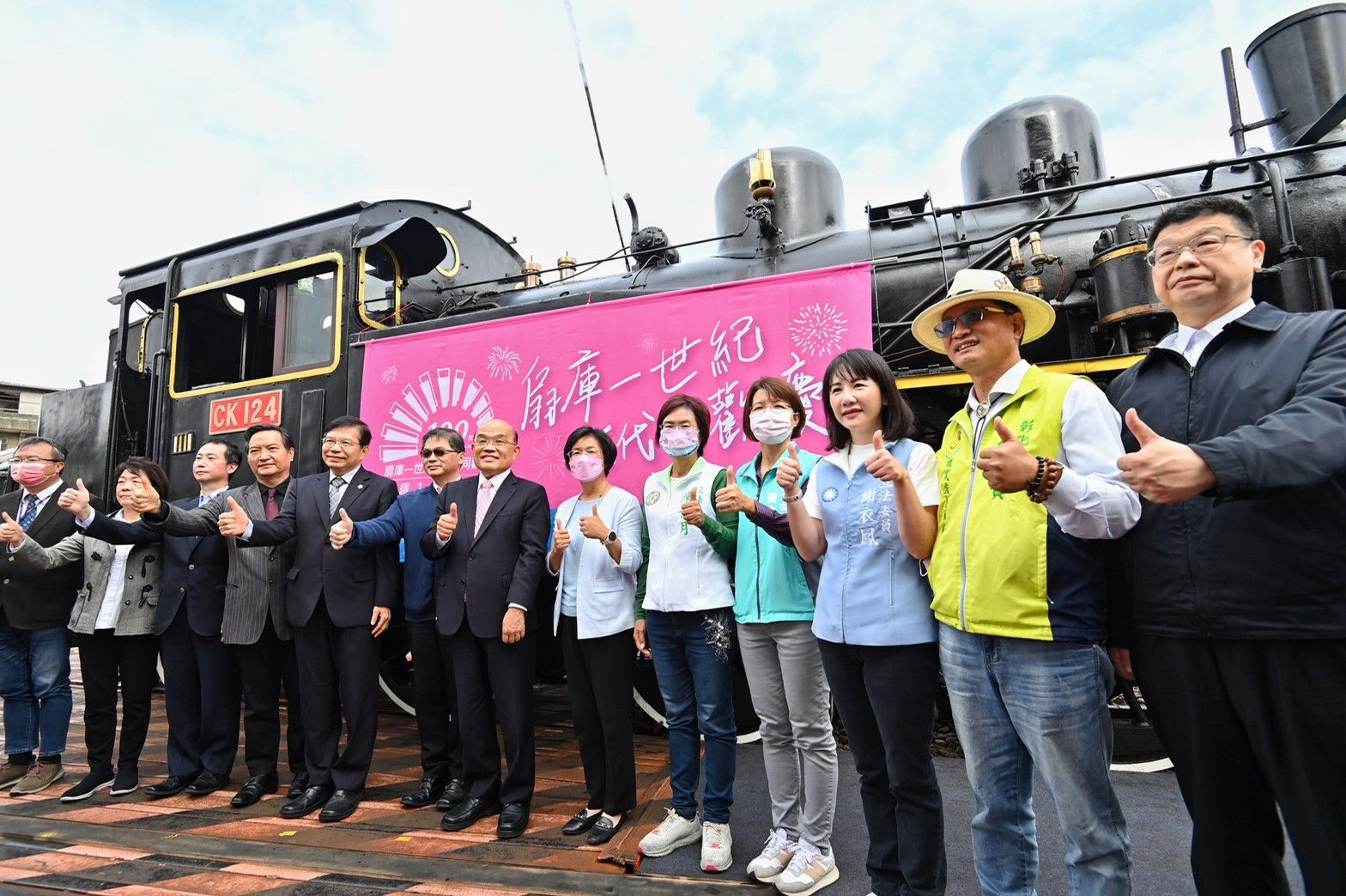 今日慶祝活動在祥獅獻瑞及鼓陣表演中熱鬧開場,蘇院長首先聽取杜微局長解說扇形車庫歷史及未來展望,並於致詞結束後,在CK124號蒸汽火車側邊與現場貴賓共同拉下「扇庫一世紀 世代同歡慶」帆布上的綵帶並合影留念。隨後,蘇院長登上CK124號蒸汽火車副駕駛室手拉汽笛,火車在鳴笛聲中緩緩駛進調車轉盤,蘇院長也在火車運行期間親自體驗往燃爐添加煤料。最後,火車繞行一圈後回到原點,圓滿完成慶祝儀式。