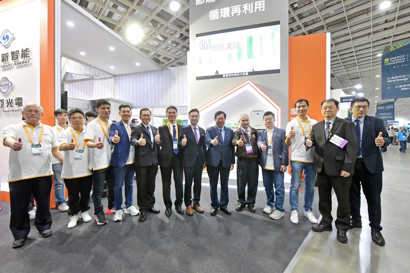 此行,鄭副院長與經濟部楊志清主任秘書、能源署吳志偉副署長、標準檢驗局謝翰璋副局長、國際貿易署戴婉蓉主任秘書、中華民國對外貿易發展協會黃志芳董事長、GESA綠能暨永續發展聯盟太陽光電委員會沈維鈞主席、風能產業委員會汪欣潔主席、智慧儲能委員會艾祖華主席,以及SEMI國際半導體產業協會曹世綸全球行銷長暨臺灣區總裁一同按下啟動按鈕,隨即出現「ENERGY TAIWAN」、「Net-Zero Taiwan」字樣,為活動揭開序幕;隨後,一行人參觀台泥儲能、東方風能、台塑新智能、聯華林德 、經濟部能源署及元晶太陽能等展區,了解各展區展出的最新技術、設備及應用成果,參展廠商也與副院長合影留念,場面熱絡。