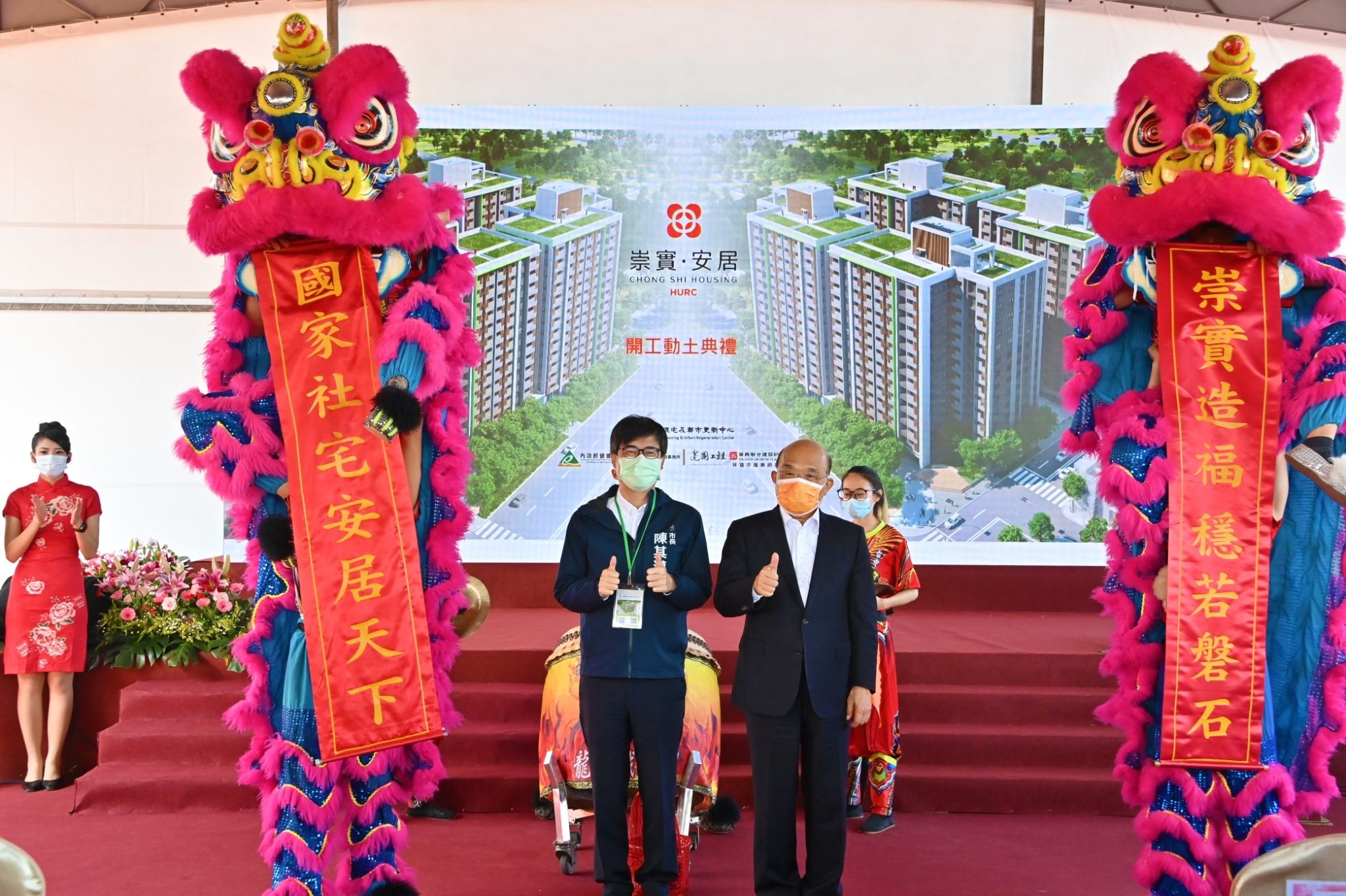 行政院長蘇貞昌今(15)日 出席「高雄市左營區崇實.安居社會住宅開工動土典禮」時表示,興建社會住宅是蔡英文總統的重大政見,行政院在第一階段4萬戶目標中,已達成近5萬戶,未來將由國家住宅及都市更新中心持續推動。院長也責請內政部、營建署及國家住都中心後續推動全國社會住宅建案時,均能預先規劃相關出入動線、水電設施、消防安檢、停車位數量及周邊生活機能等事宜,並預先規劃周邊道路、設施等,使後續均能運作良好。