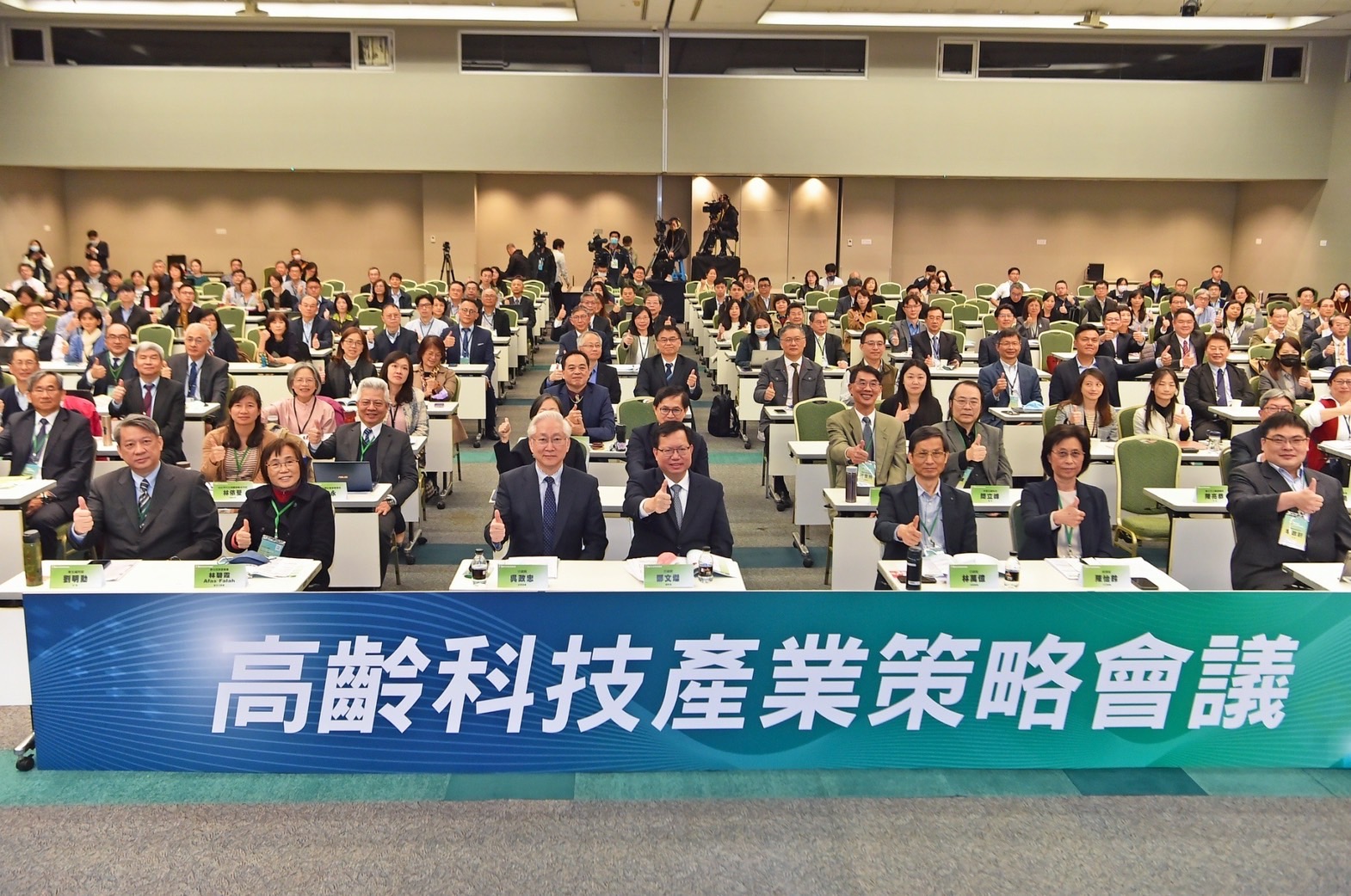 鄭副院長指出,今日會議結合產、官、學、研、醫及非政府組織(NGO)等單位,針對高齡科技產業四大議題進行討論,希望透過今日會議能夠找出高齡科技的創新方向,進一步納入行政院施政計畫中,也希望大家共同努力將完善照顧高齡者福祉的願景化為實際行動,並祝福今日會議圓滿成功。致詞結束後,鄭副院長與全場貴賓於座位上一同比讚合影留念,為本日會議揭開序幕,場面熱絡。