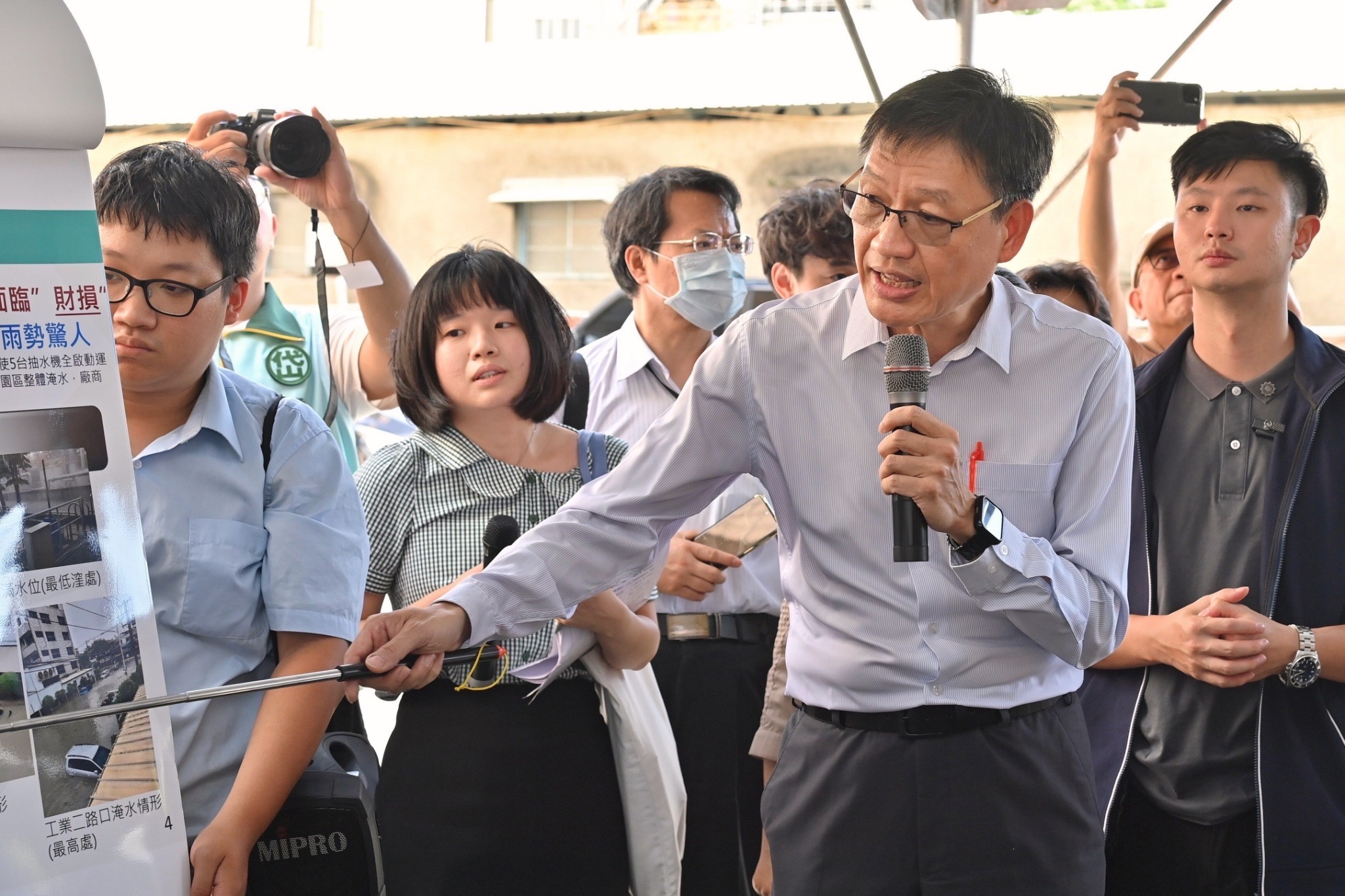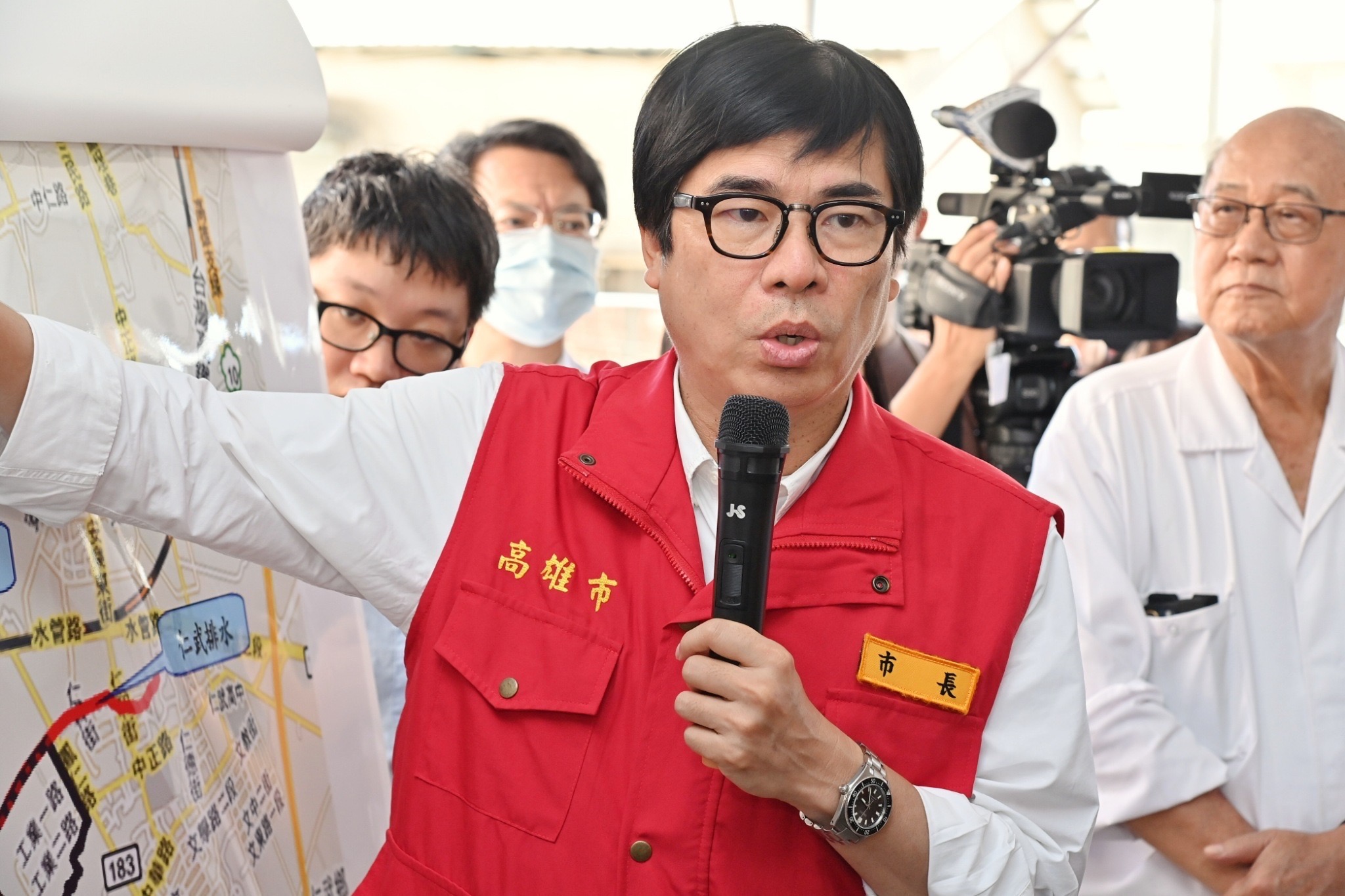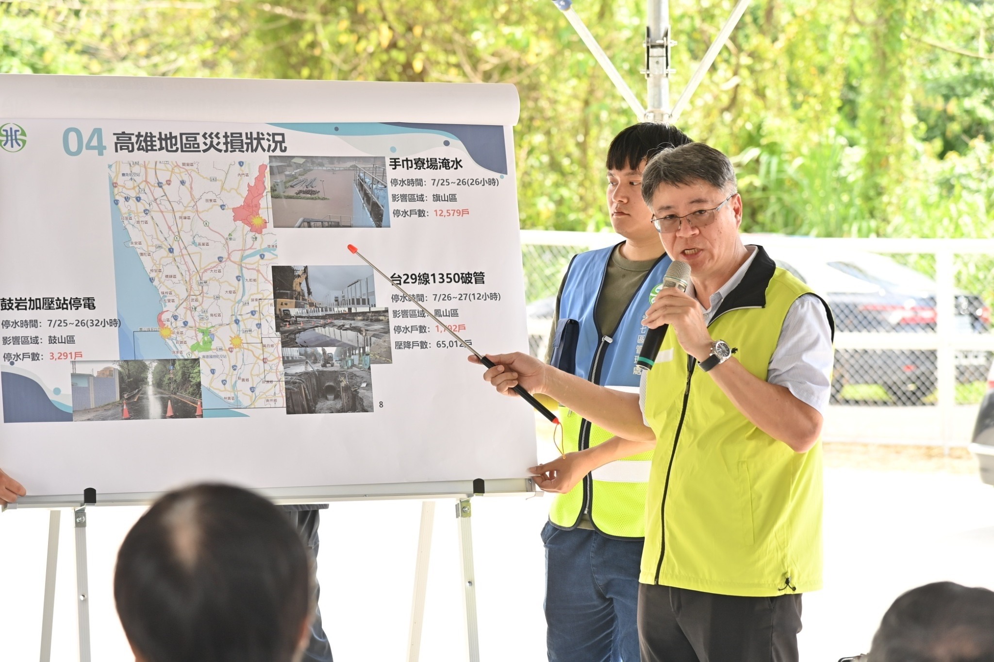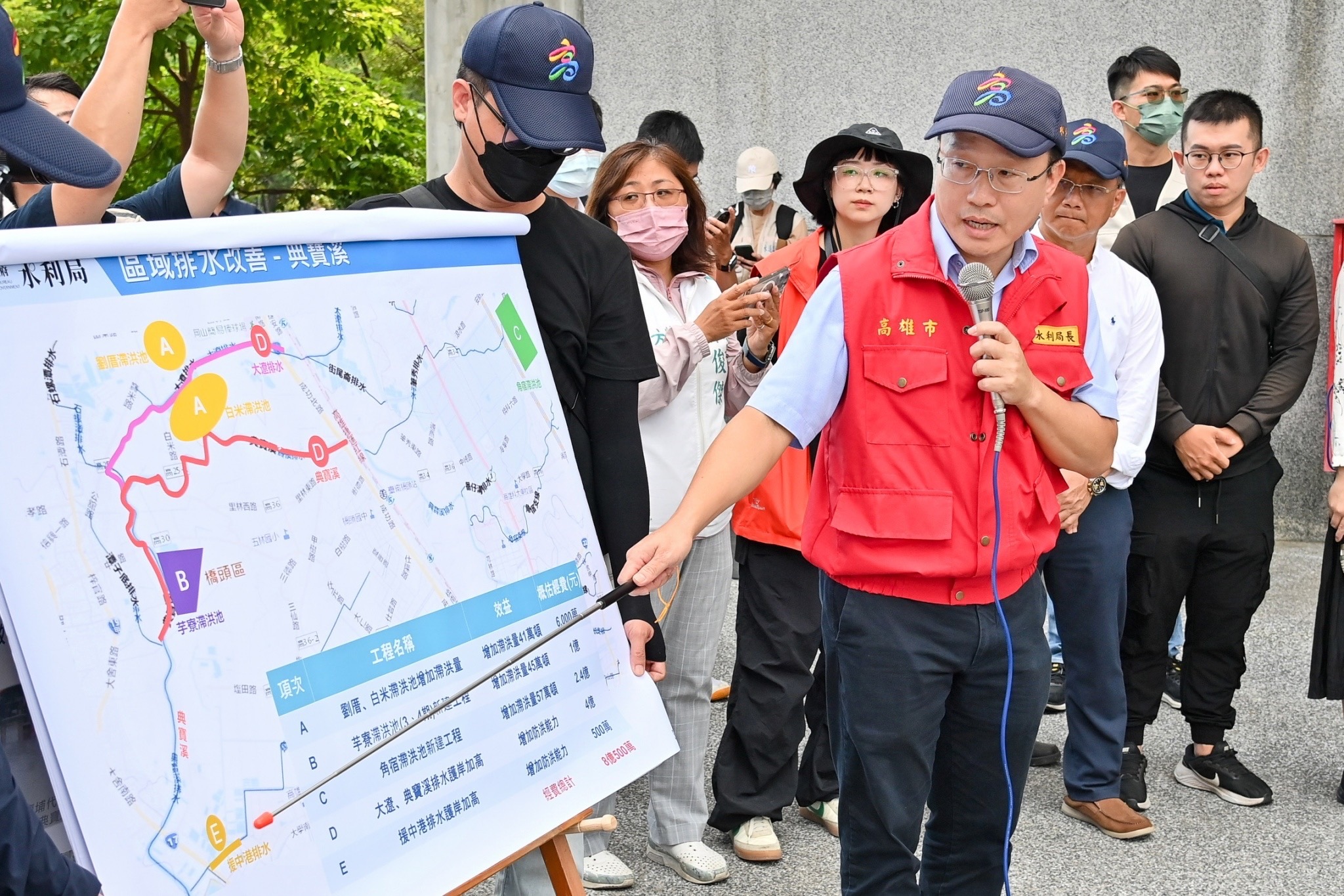 卓院長抵達寶業滯洪公園後,首先聽取高雄市水利局蔡長展局長簡報,瞭解高雄區域排水改善情形及水利工程災後復建工程,並於致詞時表示,高雄滯洪池在防洪治理上確實發揮極大效果,但此次凱米颱風短短兩三天,累積雨量已接近全國全年總雨量,且瞬間降下豪大雨,已超過高雄所有滯洪池能夠承受的負荷量,因此面對極端氣候的威脅,根本解決方法應提高現有防洪頻率與滯洪池體積的安全係數,但這無法一蹴可幾。