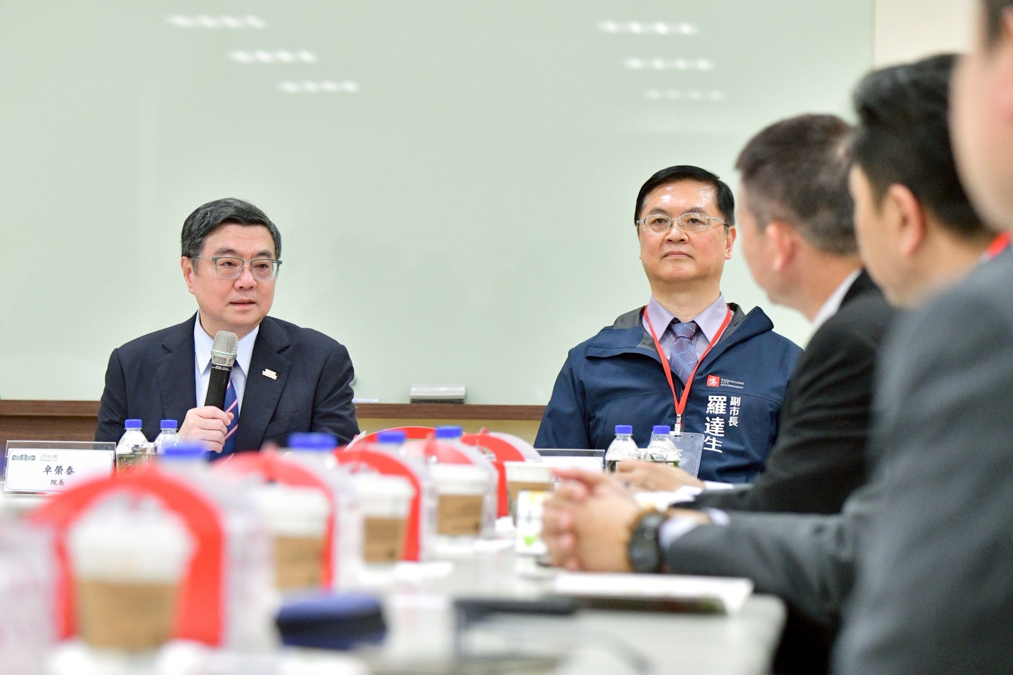 此次座談會包括行政院李慧芝發言人、南部聯合服務中心許乃文執行長、勞動部洪申翰部長、經濟部何晉滄次長、高雄市羅達生副市長等均在座。稍早卓院長一行等人參訪發展航太及精密機械設備應用的晟田科技公司,在該公司謝永昌董事長導覽下,參觀該公司機匣生產線、智慧製造產線及起落架組裝線等技術能量。