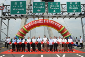 行政院長吳敦義今(14)日出席新北環河快速道路三重—中和段通車典禮致詞時表示,連結三重到中和、板橋地區的新北大橋,完工通車後不僅是台北縣最耀眼的新地標,更便捷串連起大台北地區的交通網,未來的新北市和台北市將成為閃亮的雙子城。 吳院長說,新北大橋於民國95年4月動工,當時剛就任不久的台北縣長周錫瑋即積極努力推動台北縣的交通建設,在中央與地方、不分朝野黨派的同心協力之下,新北大橋終於完工,這也是府會和諧、中央與地方建立良好夥伴關係的最佳例證。 吳院長強調,新北大橋的完工通車象徵著未來新北市的交通起飛。斜張式設計的新北大橋將成為台北縣的新景點,而隨著淡水河整治成功,也連帶改善了周遭的環境,成為縣民遊憩休閒的好地方。同時,新北大橋更符合當前節能減碳的潮流,不但開闢人行步道與自行車道,還採用可以節省近八成電費的LED燈,創造出迷人浪漫的夜景。吳院長表示,未來新北市人口可能突破4百萬,成為台灣第一大城,發展潛力無窮,期盼大家繼續合作努力,再造新北市的風華。 內政部表示,原訂於99年9月通車的新北側環河快速道路(三重─中和) 共9.6公里高架橋,內政部營建署在以獲民眾最大行車便利性的原則下,與台北縣政府工務局、交通局以及各地方公所等相關單位的積極趕辦後,目前新北環快道路主體工程驗收、接管工作,以及鄰接道路路面設施、交控管制、導引牌面、通車宣導措施等作業,已漸臻完善,並訂於今日通車,8月13日即先行開放新北大橋的人行兼自行車道及景觀平台設施,供民眾上橋體驗步行、騎乘自行車使用。 位處二重疏洪道口、大漢溪、新店溪與淡水河匯流處的「新北大橋」為新北環快道路的一部份,主橋面寛達45公尺,雙向主線各配置3車道,兩端匝道匯出入各1車道以及機車專用道。所提供的不僅是區域的交通機能,其人行道兼自行車道與景觀平台設施,更可提供民眾上橋漫步或騎乘自行車之休閒使用。新北大橋融入城市的整體景觀,與鄰近的二重疏洪道大台北都會公園景觀相互輝映。新北大橋的夜間景觀雕塑,並以當前最為節能的LED投光設計加以妝點,以RGB高彩度色階變化,打造出浪漫夜景,提供不同感受的都會生活。