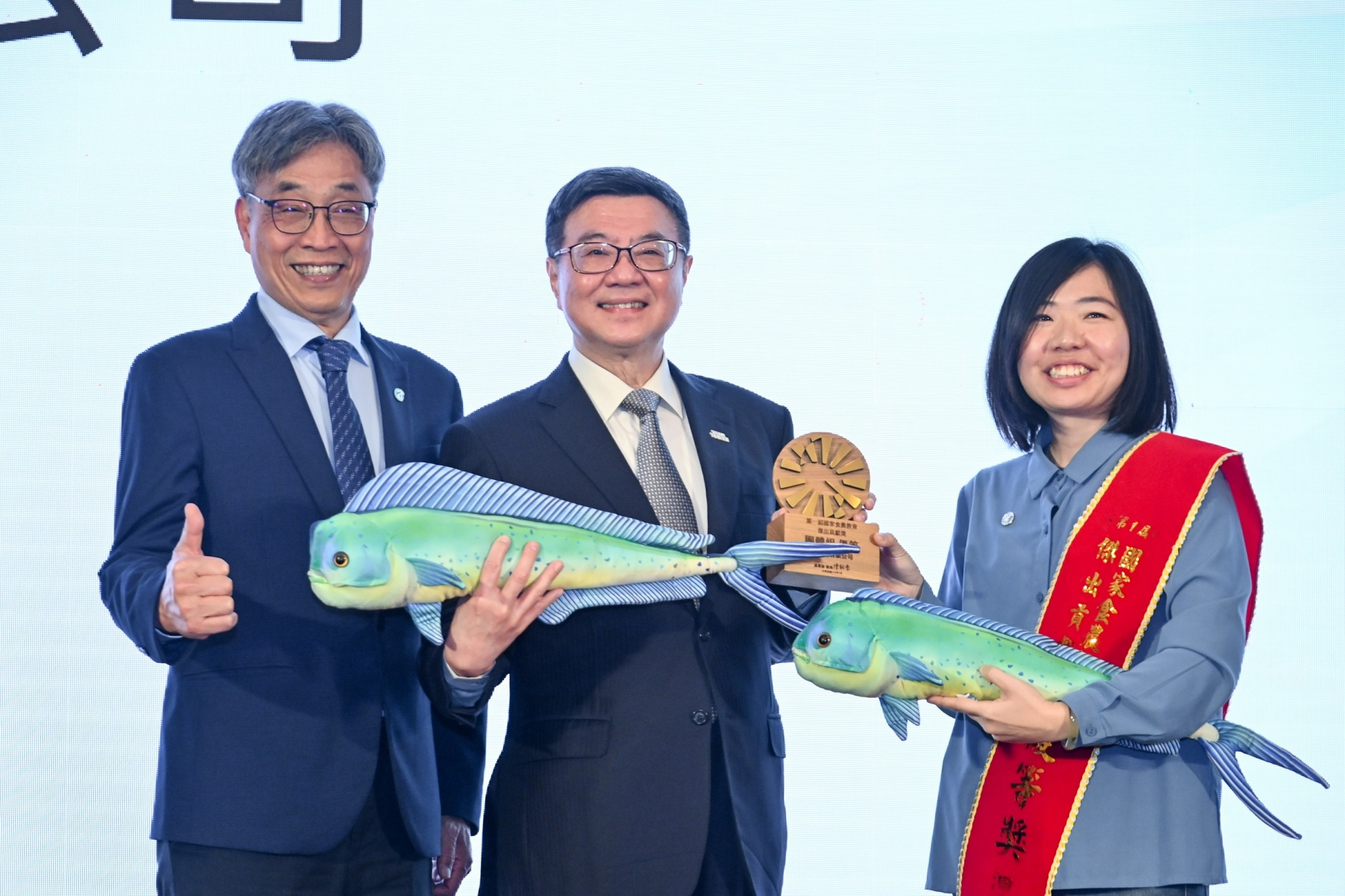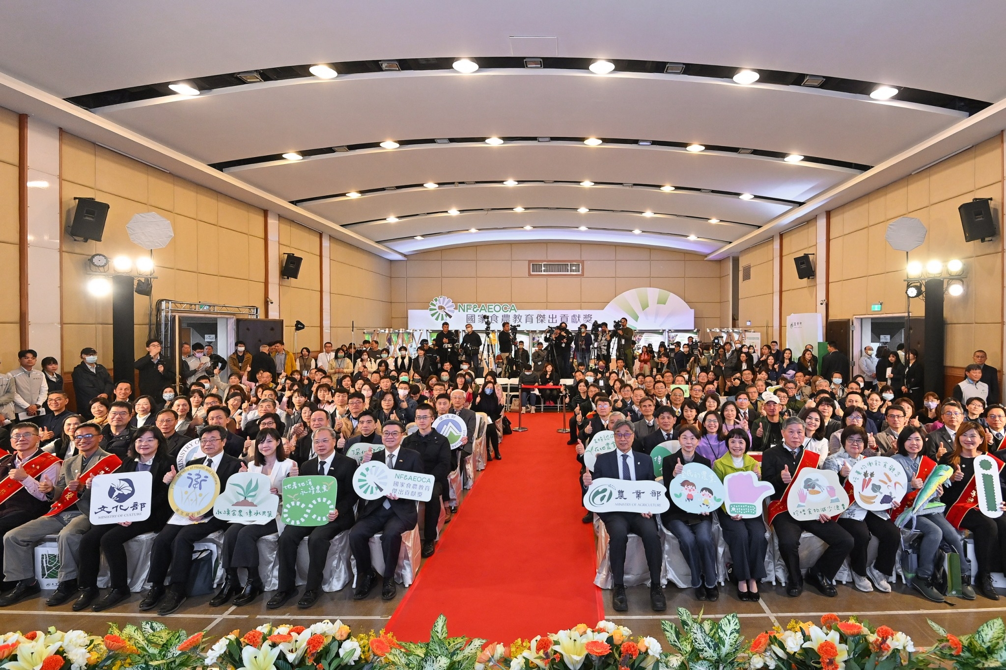 隨後,卓院長頒發食農教育「團體組傑出貢獻獎」予善用賣場作為食農教育場域的家福股份有限公司、以池上米品牌為基礎提供多元食米教育體驗的臺東縣池上鄉農會、活化老舊穀倉打造多功能食農教育場域的冬山鄉農會良食農創園區、推行「食好稻相報,驚奇RICE秀」友善耕作課程的宜蘭縣羅東鎮立幼兒園、成立「洄遊吧食魚體驗館」的花蓮縣洄遊吧有限公司、促進校園落實食魚教育的財團法人台灣養殖漁業發展基金會、製作「Foodie Goodie夢想食驗室」Podcast的財團法人灃食公益飲食文化教育基金會、以石斑魚為主軸推廣食農教育的高雄市永安區新港社區發展協會、以臺灣鯛為主題融入客家文化與雙語教育的高雄市立南隆國中,以及以香菜設計課程結合AR與VR製作數位教材的彰化縣立北斗國中,並與所有獲獎者合影留念。包括行政院龔明鑫秘書長、李慧芝發言人、農業部陳駿季部長、衛生福利部周志浩次長、文化部徐宜君次長等均出席今日活動。