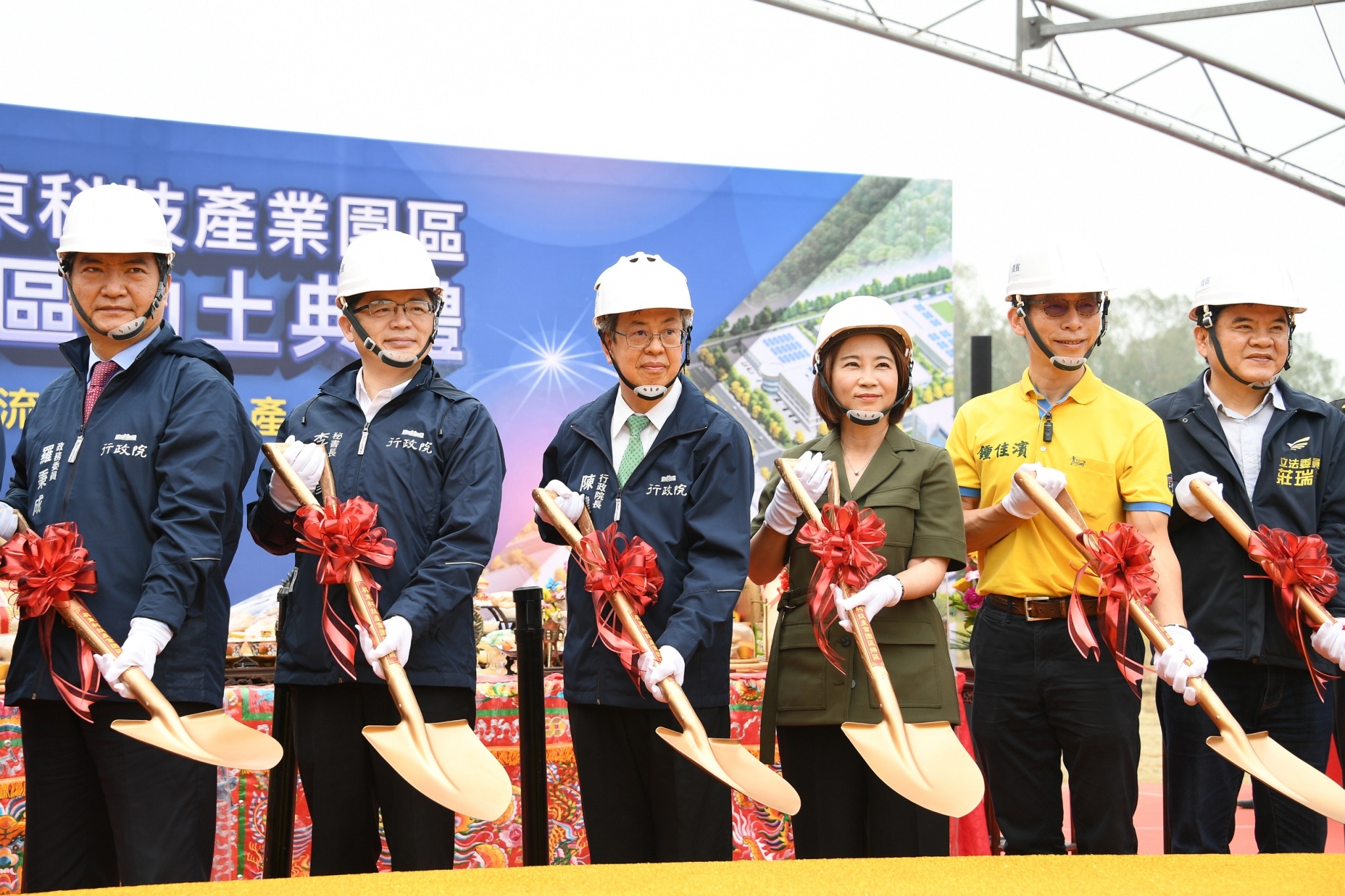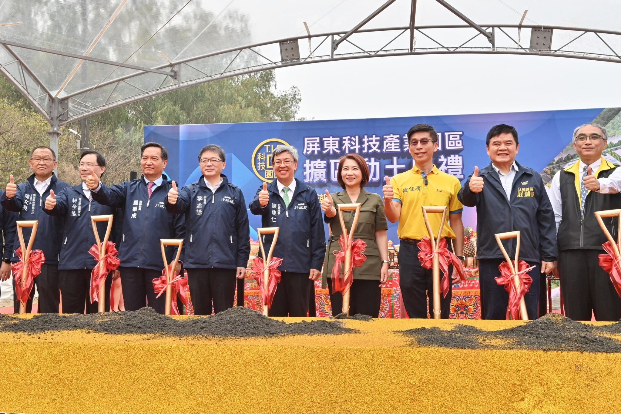 今日動土典禮在祥獅獻瑞的鑼鼓聲中熱鬧開場,陳院長蒞臨會場後,首先與現場貴賓共同觀看「引領科技潮流・深化產業群聚-屏東科技產業園區擴區計畫」影片,隨後,陳院長於開工祝禱後,提起金鏟,起鍬三鏟,完成動土儀式,並與現場貴賓們合影留念。