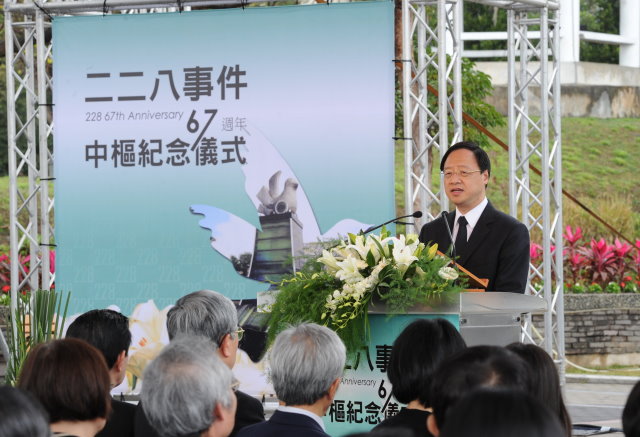 行政院長江宜樺今(28)日陪同馬總統到花蓮縣和平廣場出席「二二八事件67週年中樞紀念儀式」時表示,「二二八」是臺灣歷史上重大的不幸事件,也是造成臺灣在1947年後,社會長期分裂及人心不安的歷史事件。多年來,這事件從無法看到真相及獲得討論,到目前被平反及追悼,全部歷程可說是臺灣民主發展史最真實的寫照。