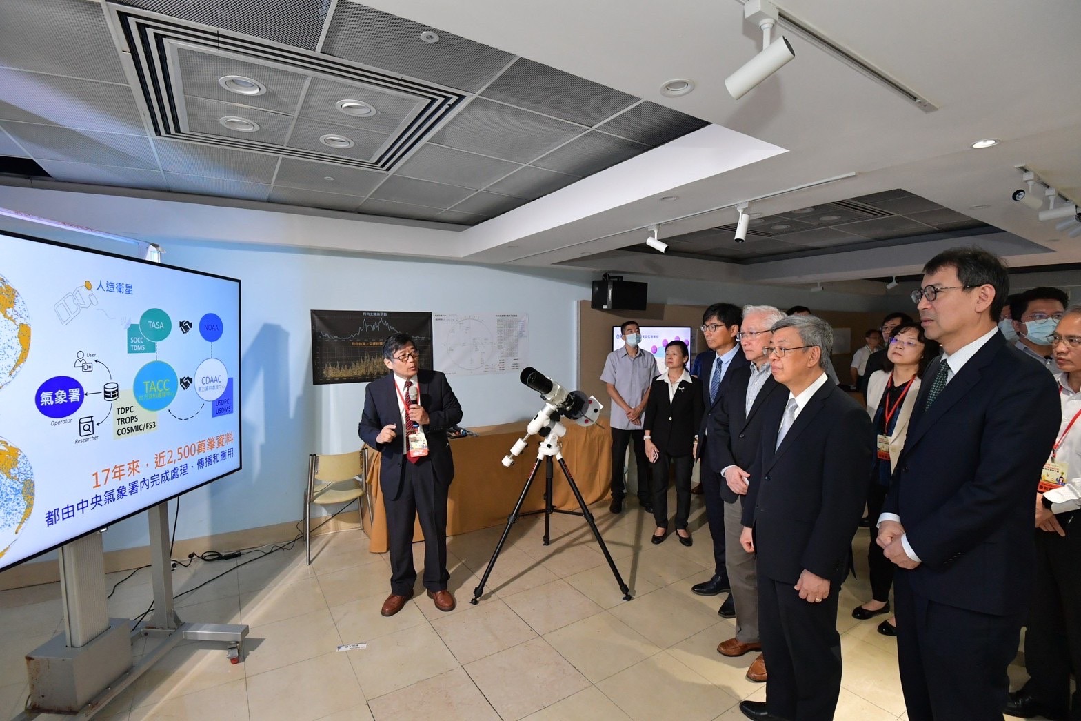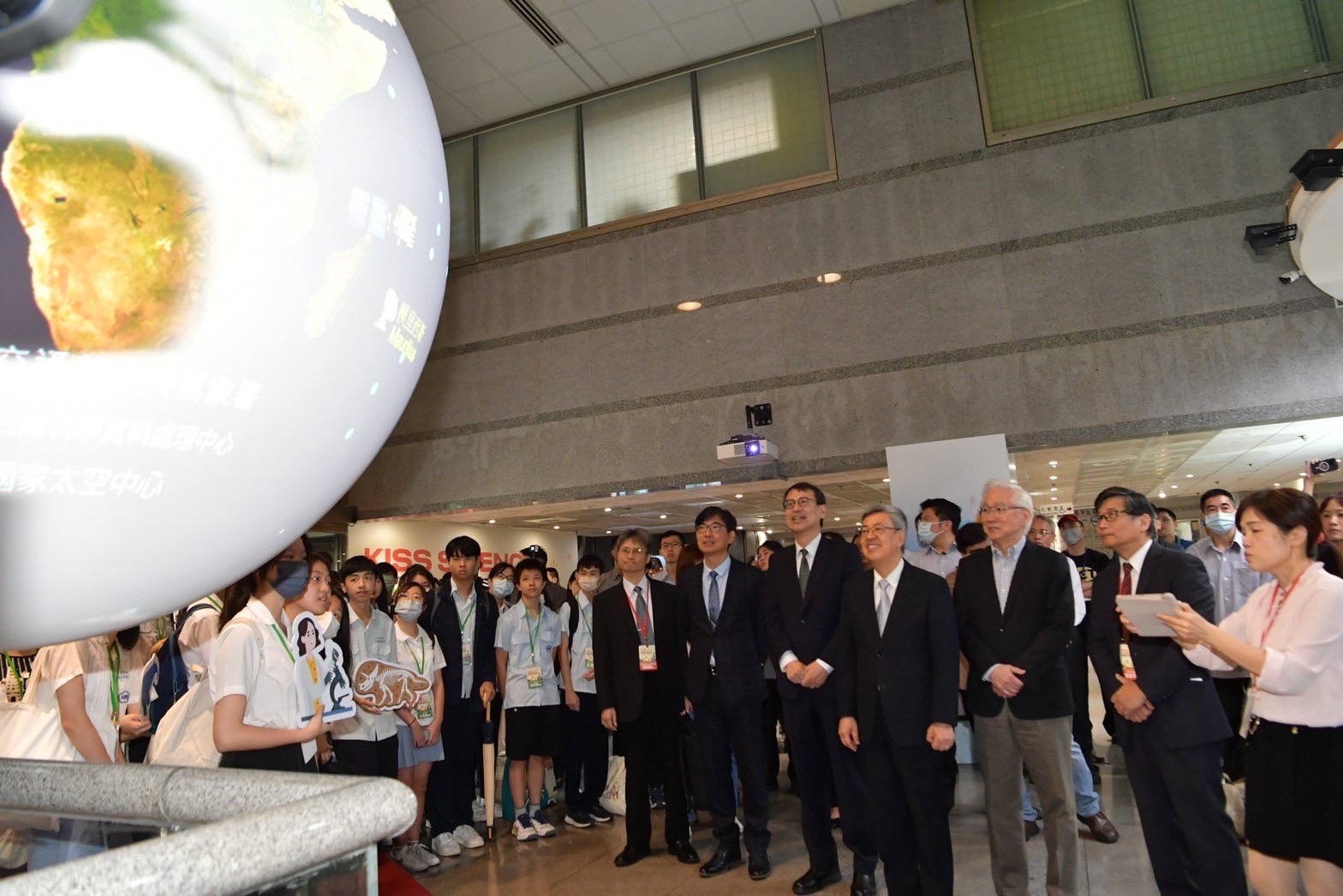 此行,陳院長抵達中央氣象署環形劇場後,首先與貴賓手持典禮手板在座位區合影,並於致詞結束後,觀賞「Kiss Science 給我報報」氣象行動劇表演,由師大附中、臺北市無界塾實驗教育機構、高雄女中、花蓮女中等學生扮演氣象特派員,自典禮現場連線直播國家地震工程研究中心臺北實驗室、成大海洋生物及鯨豚研究中心、漢本海洋驛站等處的活動實況。隨後,陳院長在中央氣象署程家平署長陪同解說下,聽取衛星雷達、太空天氣、數值天氣預報及AI展區、地球展示系統等導覽,並與行政院林子倫發言人、國家科學及技術委員會吳政忠主任委員、中央氣象署程家平署長等人於地球展示系統前,與參與活動的高中師生合影留念。
