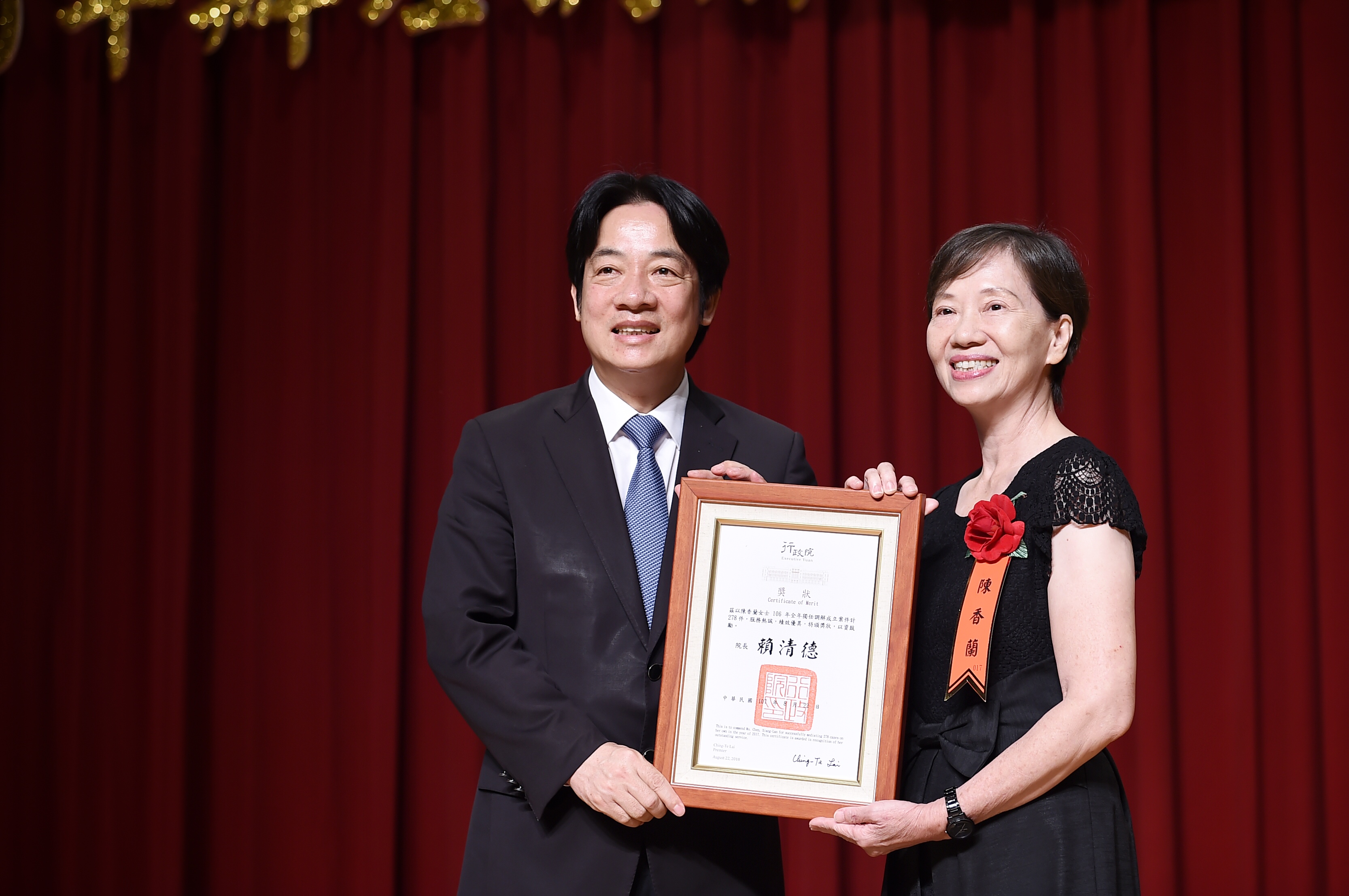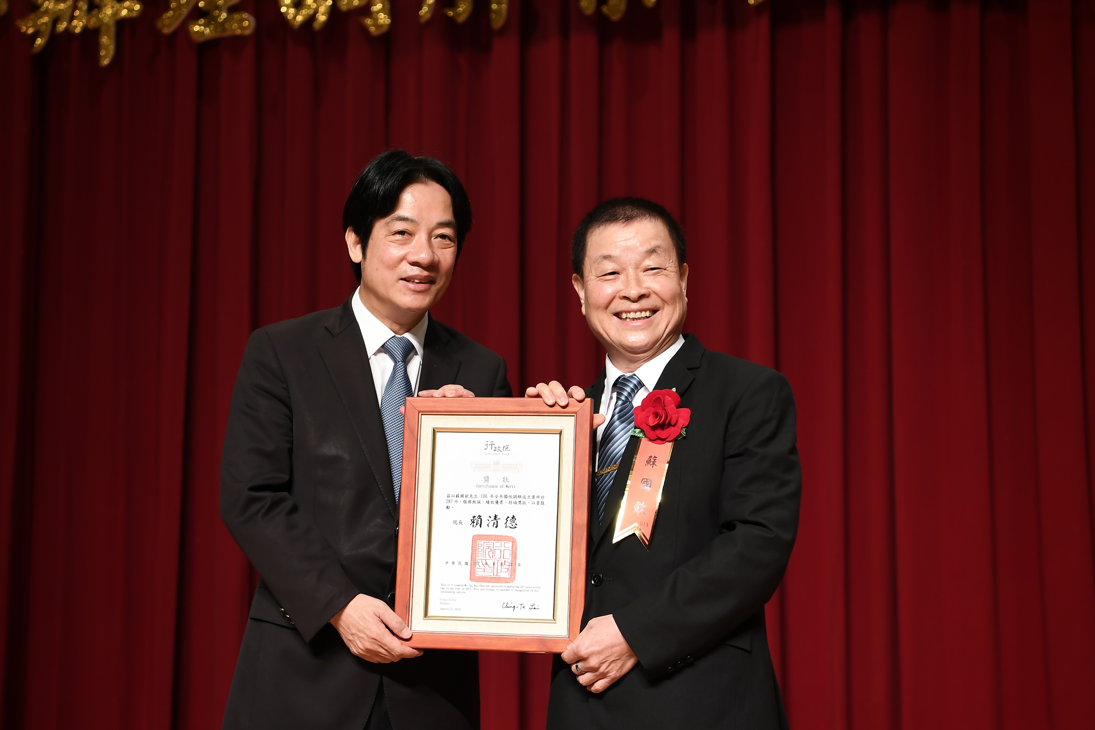 行政院長賴清德今(22)日出席「106年調解案件榮獲中央各獎項績優人員表揚大會」時表示,全台約有四千名調解委員,去(106)年共受理14萬1,512個案件,有11萬2,711件調解成功,成功率達79.6%,不但降低社會成本,也免去民眾奔波法院之苦,因此內政部及法務部每年皆共同舉辦頒獎典禮,表彰相關人員對社會的貢獻。