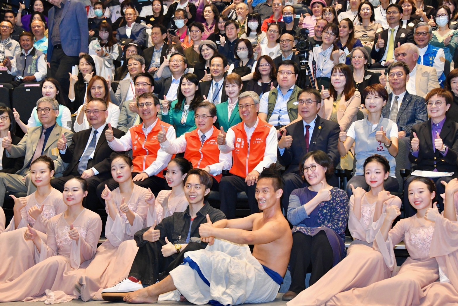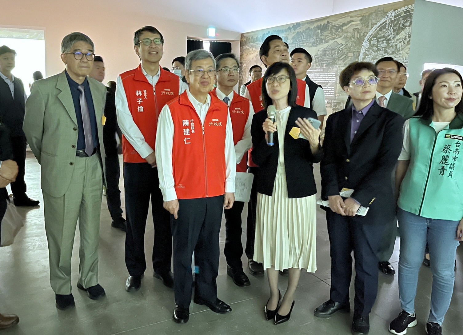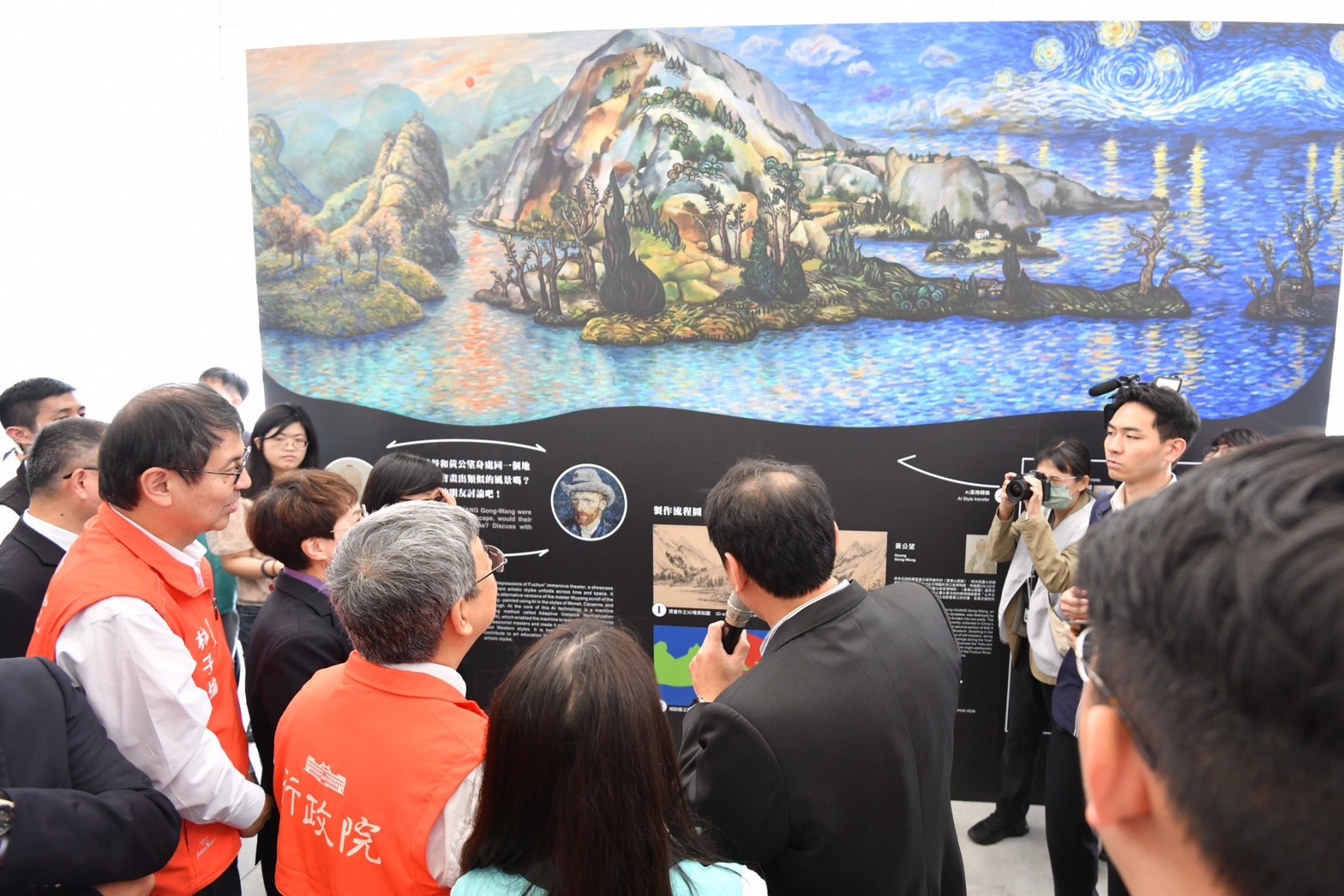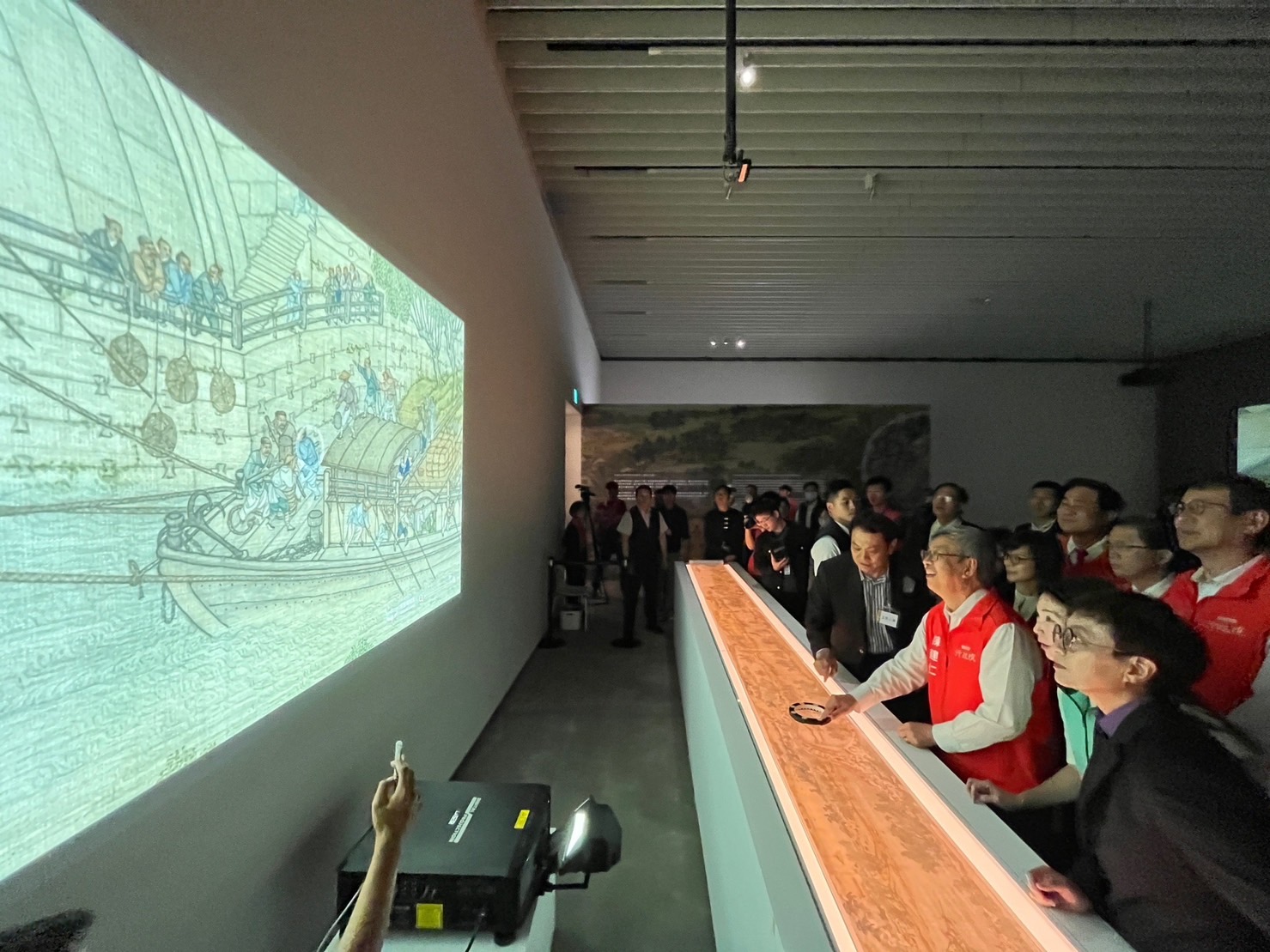 陳院長到場後,首先欣賞表演藝術家張逸軍老師及家齊女中學生帶來的開場舞蹈「經緯交織的時光身影」,並於致詞結束後,與行政院李孟諺秘書長、林子倫發言人、國立故宮博物院蕭宗煌院長、黃永泰副院長、余佩瑾副院長,陳亭妃立委、臺南市黃偉哲市長、趙卿惠副市長兼臺南市美術館董事長、南美館林秋芳館長等貴賓一同合影留念;隨後,院長一行分別參觀〈清院本清明上河圖〉數位動畫、〈翠玉白菜〉、〈玉龍紋盤〉與〈白玉錦荔枝〉等故宮典藏珍品,以及「富春印象」沉浸式劇場,對於透過AI技術繪製出歐洲巨匠畫風的「富春山居圖」,眾人皆感到讚嘆與驚豔。