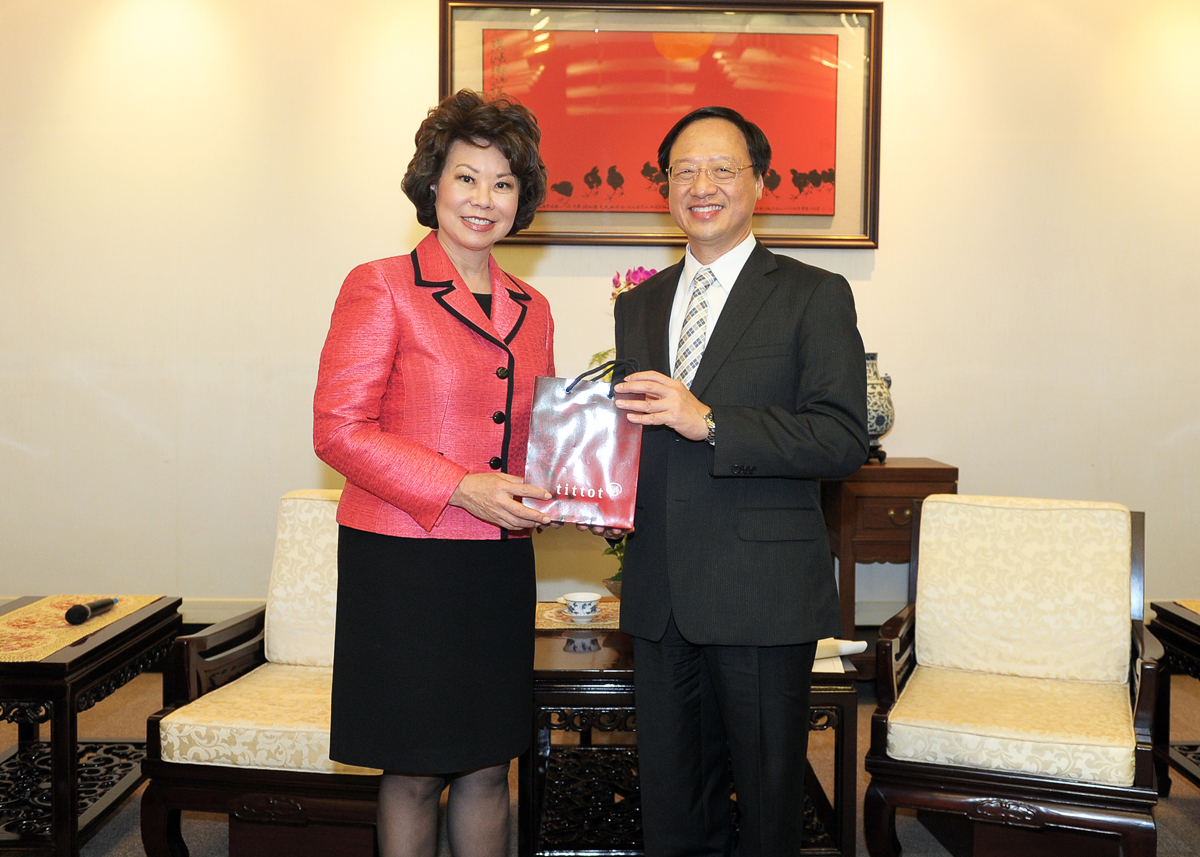 行政院長江宜樺今(14)日接見美國前勞工部長、傳統基金會傑出研究員趙小蘭(Elaine L. Chao)一行人時表示,趙前部長出生臺灣,小學時隨家人移民美國,曾擔任美國聯邦運輸部副部長及勞工部長等要職,是美國第一位華裔與亞裔女性閣員,也是臺灣的榮耀。