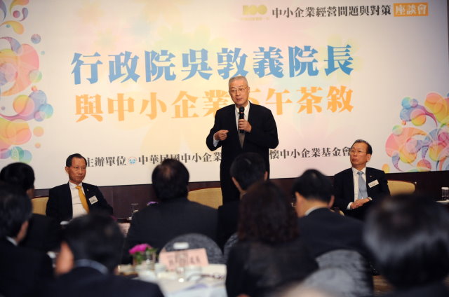 行政院長吳敦義今(7)日下午在與中小企業茶敘座談時表示,為全面提升台灣的國際競爭力,政府已降低營業所得稅並簽訂ECFA,實踐馬總統所揭示「壯大台灣、連結亞太、佈局全球」經濟戰略的重要政策。他強調,政府存在的目的,就是要幫助全國人民;對工商業而言,就是幫助業者做生意並提升台灣的競爭力。