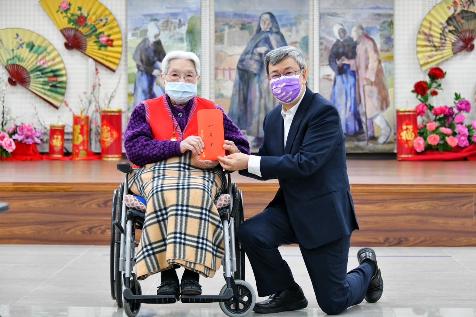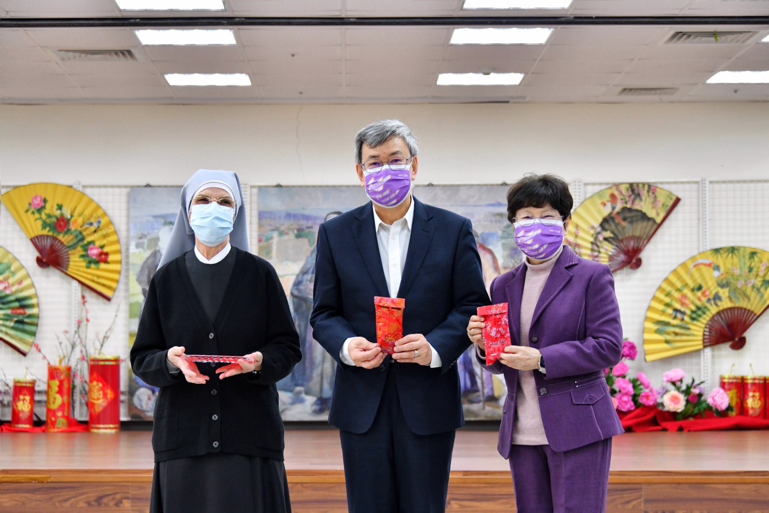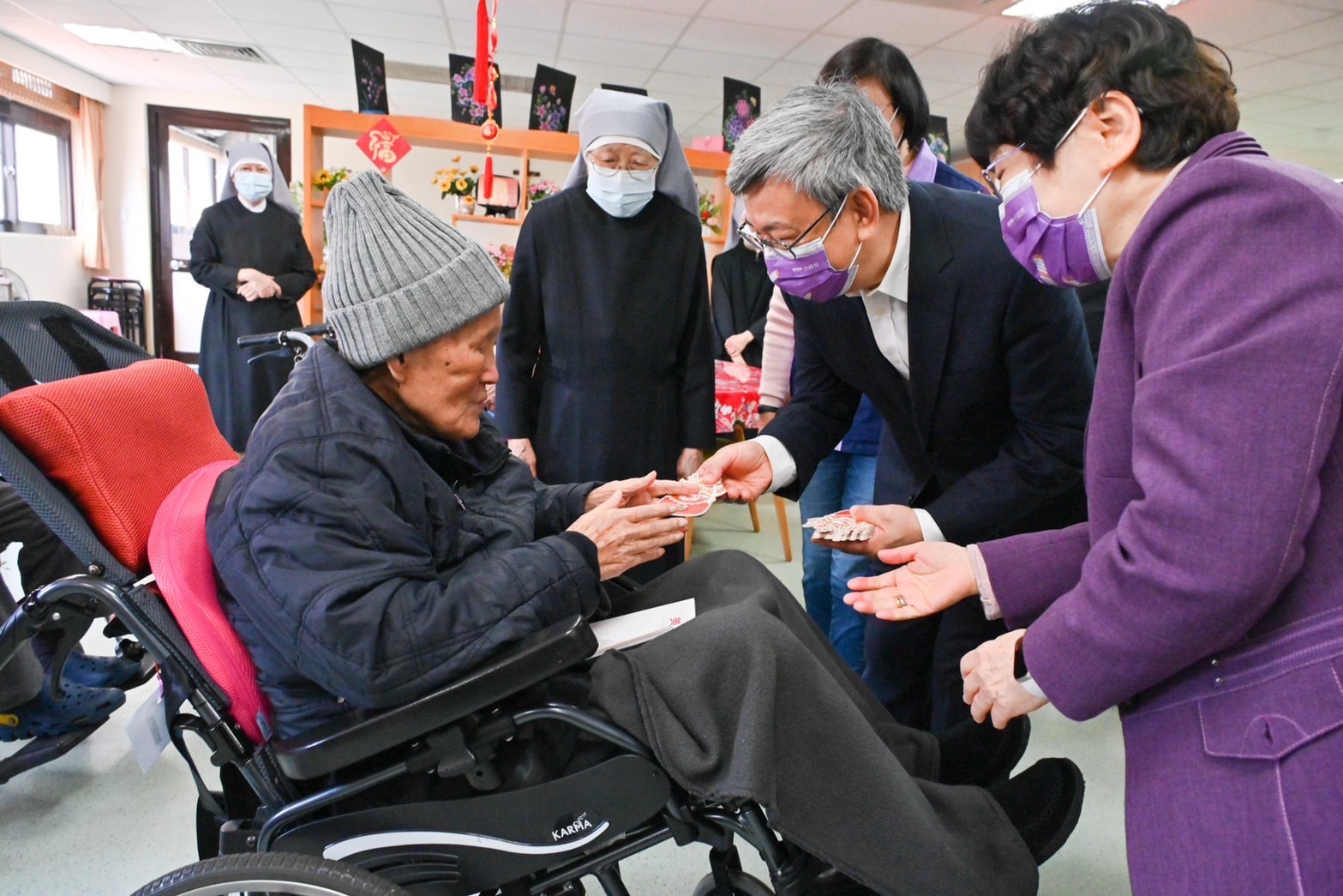 此行,陳院長偕同夫人抵達後,與行政院林子倫發言人、衛生福利部周志浩次長、社會及家庭署周道君副署長、新北市政府社會局李美珍局長、新北市鄭宇恩議員、台灣天主教安老院顧志珍董事長、應博愛院長、江芳貞副院長、涂阿菊主任及院內長者合影留念,隨後欣賞安老院打擊樂團演奏《請求瑪麗亞》及《瀟灑走一回》等歌曲,並聽取涂主任簡介安老院成立背景與運作概況;致詞結束後,院長致贈加菜金及龍年賀歲福袋,由安老院長者廖快妹代表受贈,應院長也回贈安老院製作的福袋予院長伉儷;接續,院長前往院區2樓聖堂、感恩走廊及住民生活區等空間參觀,並在聖堂祈禱,同時也與院區長者拜年問候,場面溫馨。