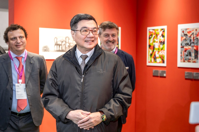 今(2025)年台北國際書展主題國為義大利,卓院長特別參觀義大利主題國館,聽取義大利經貿辦事處謝宜達專員介紹館內亮點。該館由義大利波隆那兒童書展主辦,包括:「新生代畫家-插畫與漫畫 (Matite giovani. Tra illustrazioni e fumetto)」展及義大利童書繪本精選展等2大特展。此外,義大利經濟貿易文化推廣辦事處龍博文(Marco Lombardi)代表特別向院長介紹限量版法拉利聖經《Il Fascino Ferrari》,書中記載法拉利的光榮歷史,包裝為仿法拉利V12引擎汽缸的鋁質外框別。