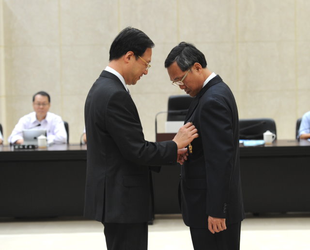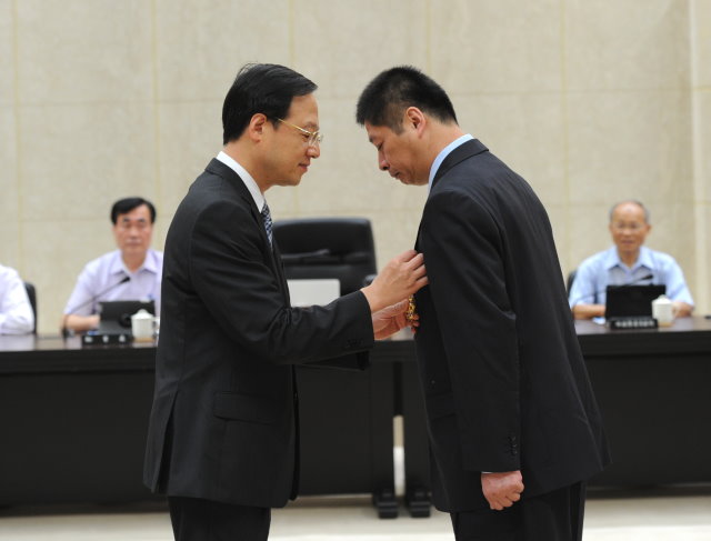 行政院長江宜樺今(18)日在行政院會頒發查緝劣質豬油事件有功人員功績獎章給本次油品事件檢舉的農民、臺中市政府警察局第一分局偵查佐吳治明二位有功人員功績獎章,江院長對於相關單位齊心合力積極努力下,揭發此一食品安全問題,辦理過程中相關同仁不畏艱難,打破既有權責及管轄思維,共同為國人食品安全不辭辛勞,他特別表示由衷的感謝與肯定。