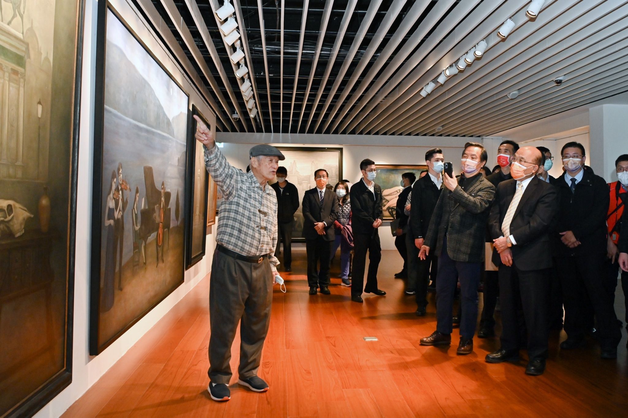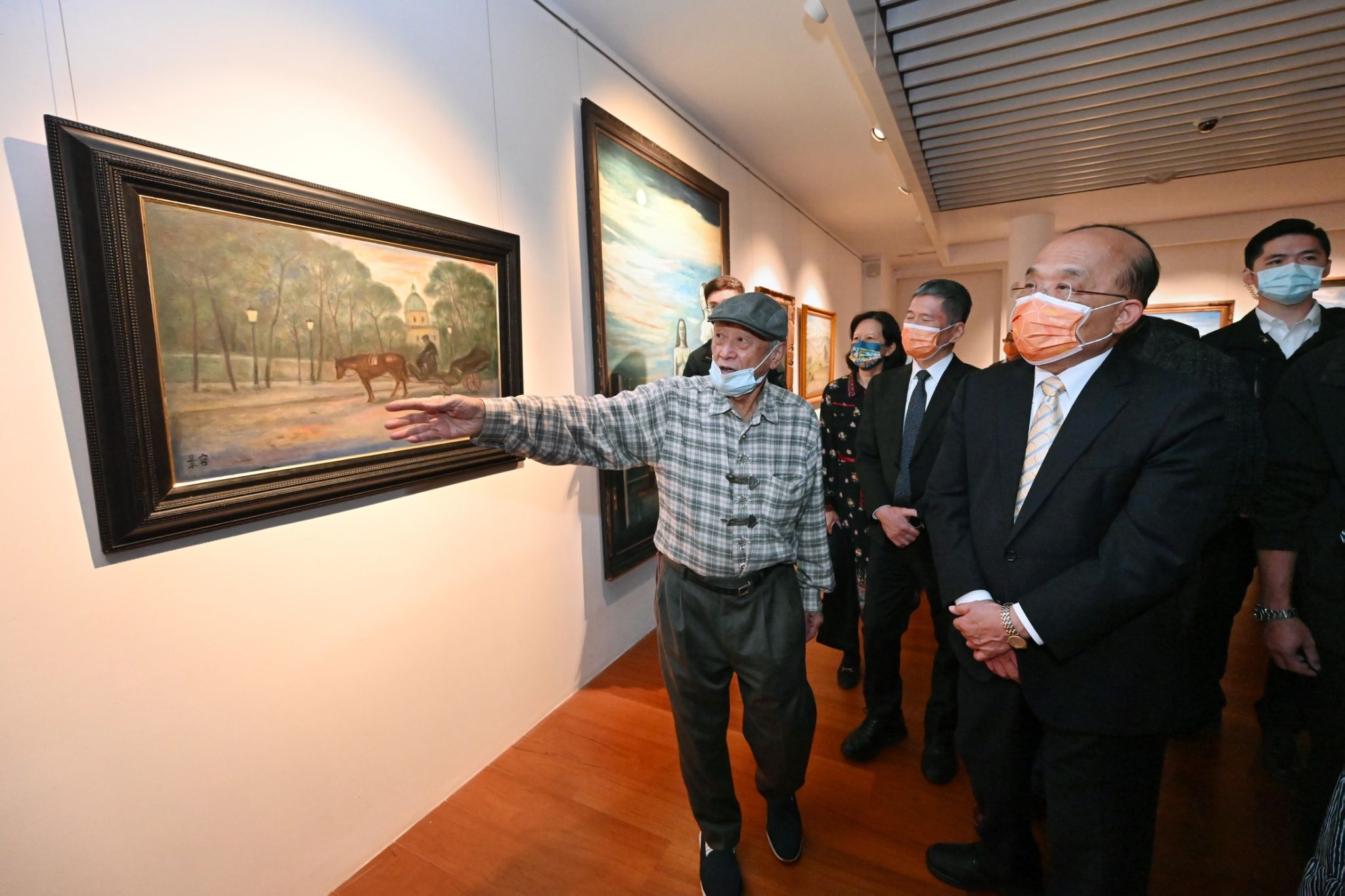 致詞結束後,蘇院長在廖董事長帶領下,參觀現場展出靜物、風景畫等畫作,廖董事長也分享交流創作方式及當下創作心境;隨後,蘇院長前往參觀「陳景容90風華藝術成就展」,由高齡近90歲的陳景容畫家親自導覽畢生得獎畫作、各式寫實畫作、濕壁畫與近兩年的超現實創作,並細細述說每項作品的創作緣由。