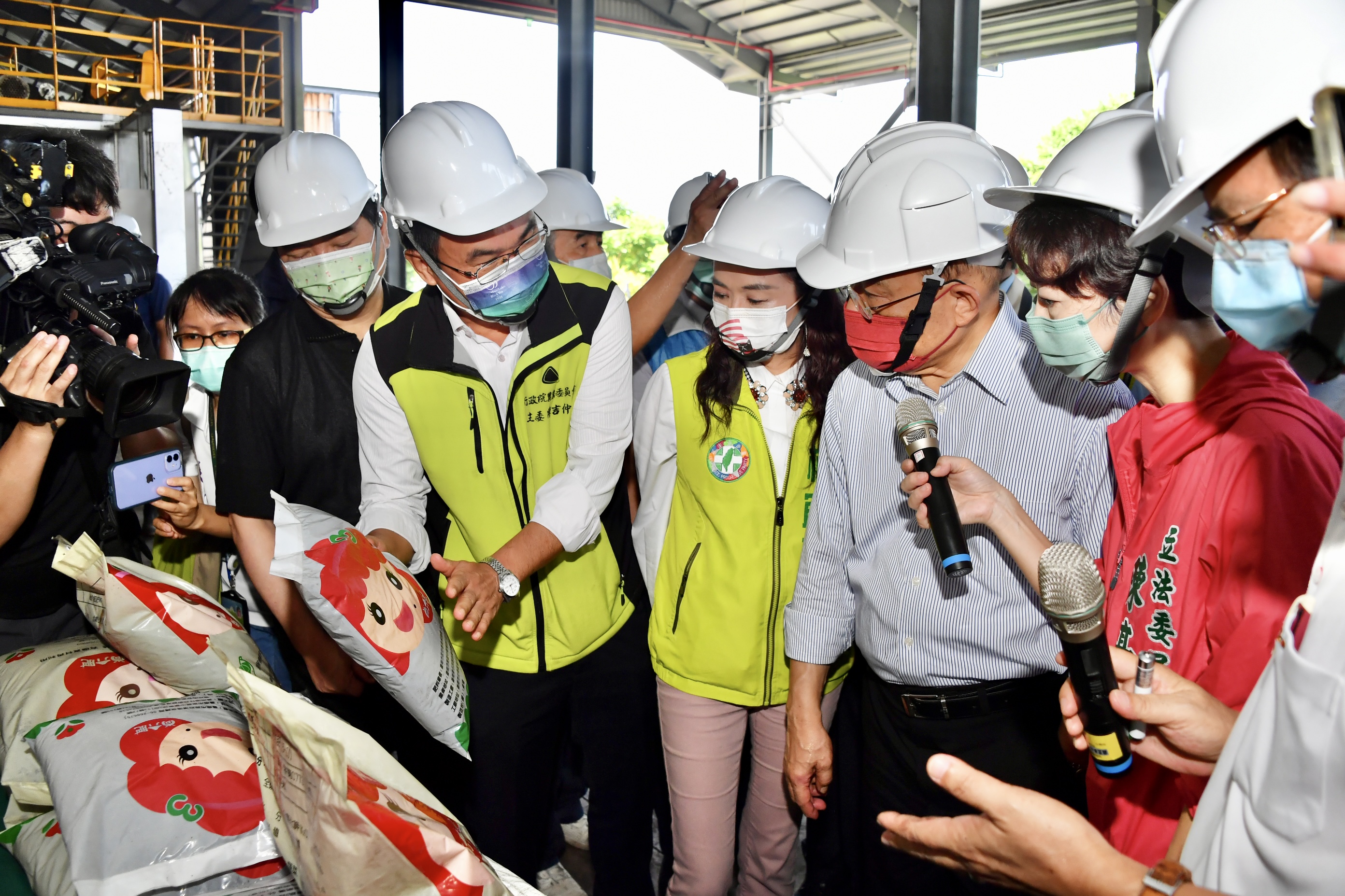 此行,蘇院長現地視察臺南市城西廚餘高速發酵廠,先後參觀進料貯槽區、高速發酵槽,及培養土成品區、包裝區,瞭解廚餘逐步轉變為堆肥的流程。院長期盼廠方優化及精進廚餘堆放、高速發酵等程序,並將成功的經驗推廣至其他廠區。院長也向廠區同仁致意,盼他們繼續加油。