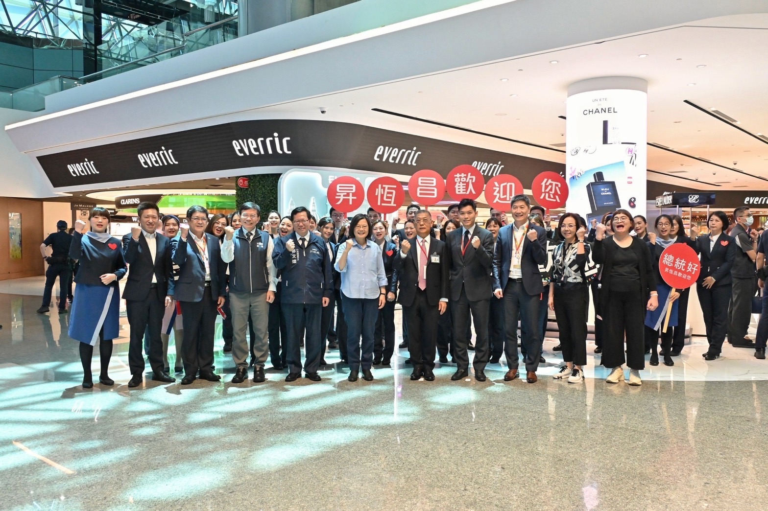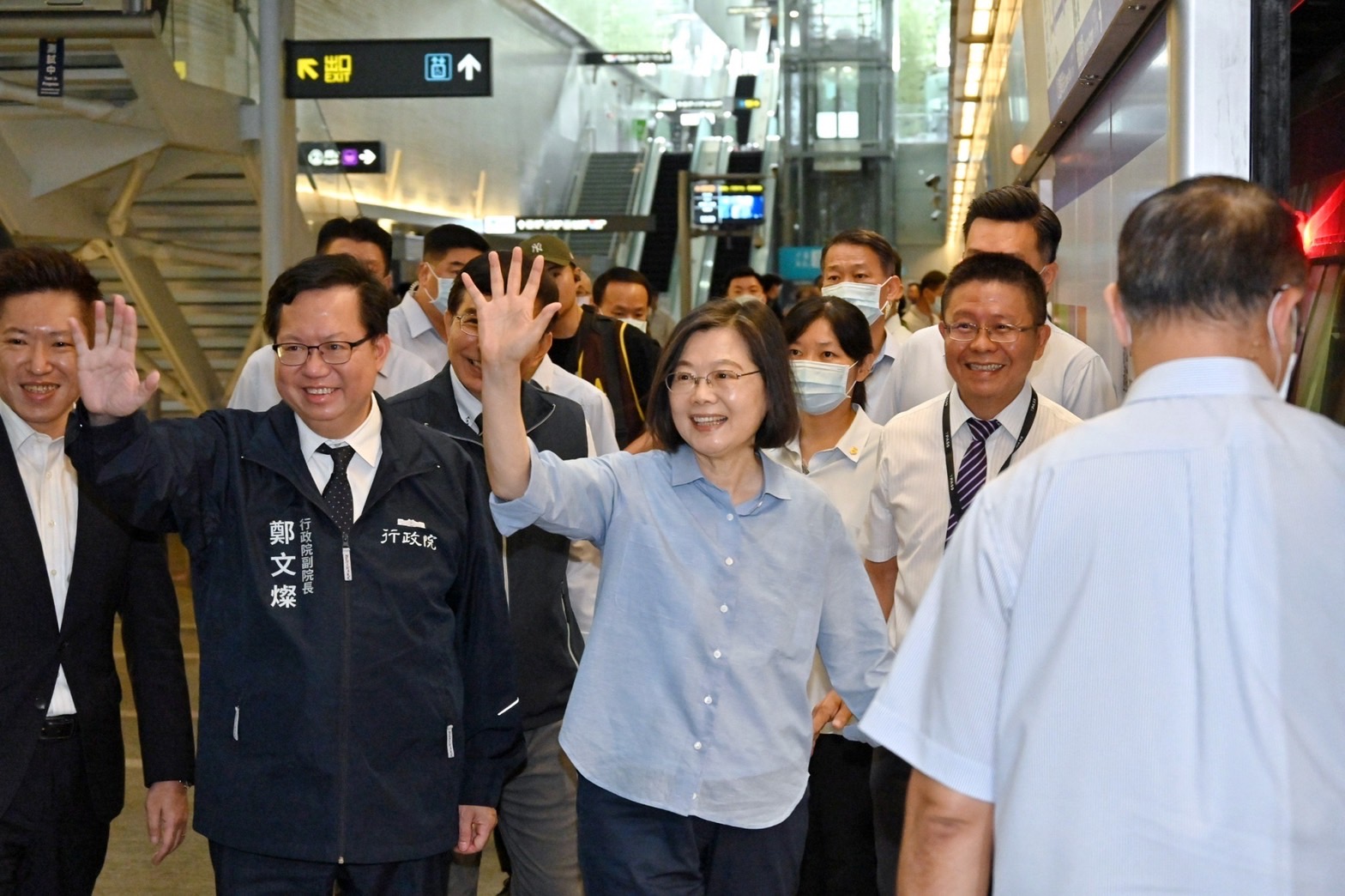 今日鄭副院長首先抵達機場捷運A1臺北車站,先至TPASS專用通道了解設置及使用情形,並陪同蔡總統進行TPASS加值、設定,隨後進站乘車至A13桃機二航廈站。抵達桃園機場後,聽取交通部觀光局黃易成組長說明「加速擴大吸引國際觀光客方案執行情形」簡報,並欣賞交通部觀光局「Show@Taiwan」生態篇宣傳影片以及日本與泰國之臺灣觀光宣傳影片;接著,副院長陪同蔡總統至桃機二航廈入境大廳的「遊台灣金福氣—自由行旅客來臺消費金抽獎活動」專區,一同體驗抽獎活動,並至免稅店視察營運現況,與現場民眾及免稅店同仁互動熱絡並合影留念。