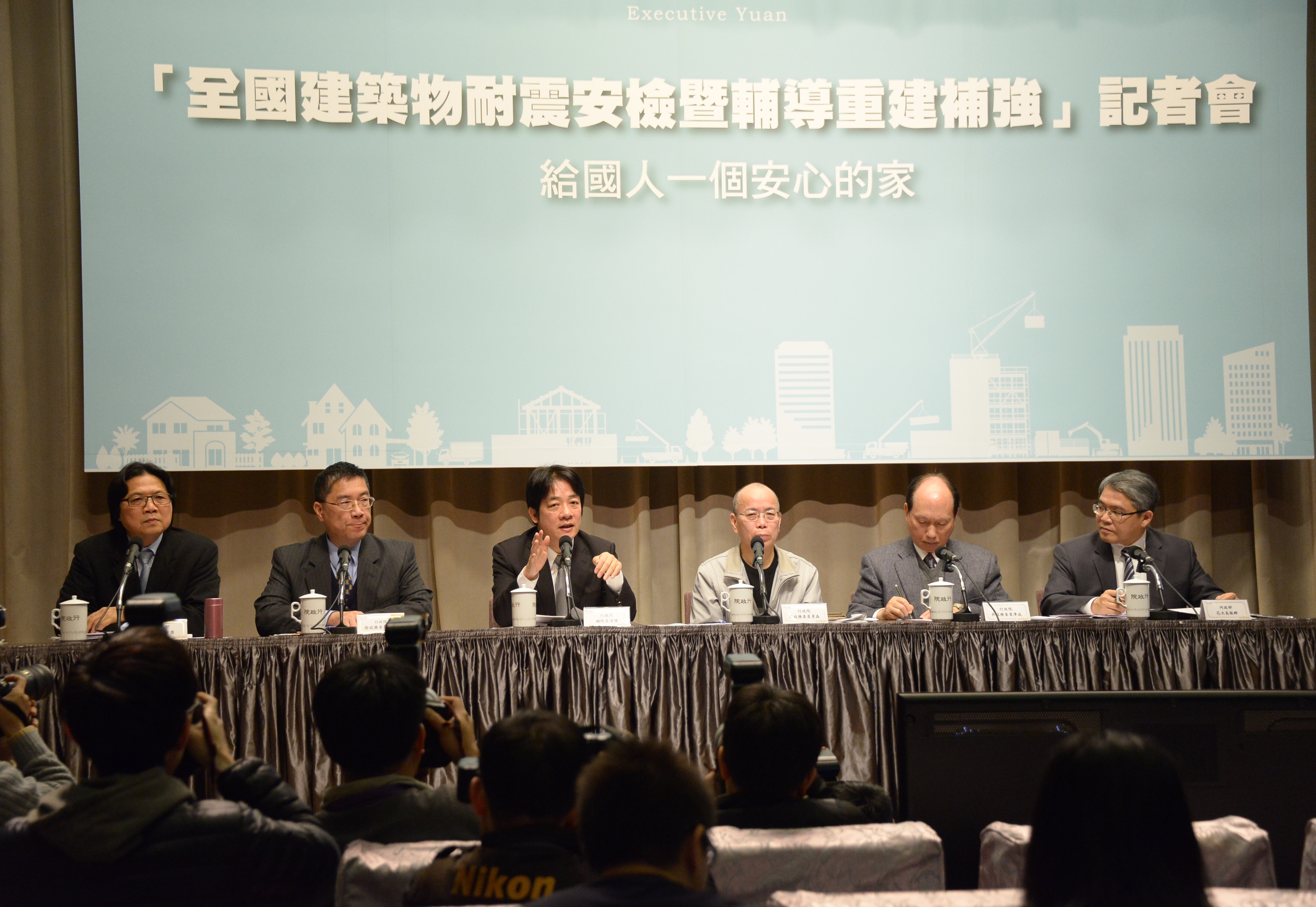 賴院長表示,台灣地震頻繁並造成重大傷害,例如今年0206花蓮地震、兩年前的台南地震,以及民國88年的中部大地震。每次地震國人都非常關心,均出錢出力,協助救災、震災及重建等工作。今天記者會主要是向國人報告目前政府的作為,並希望在政府及民間共同合作下,提高國內建築物的耐震程度。