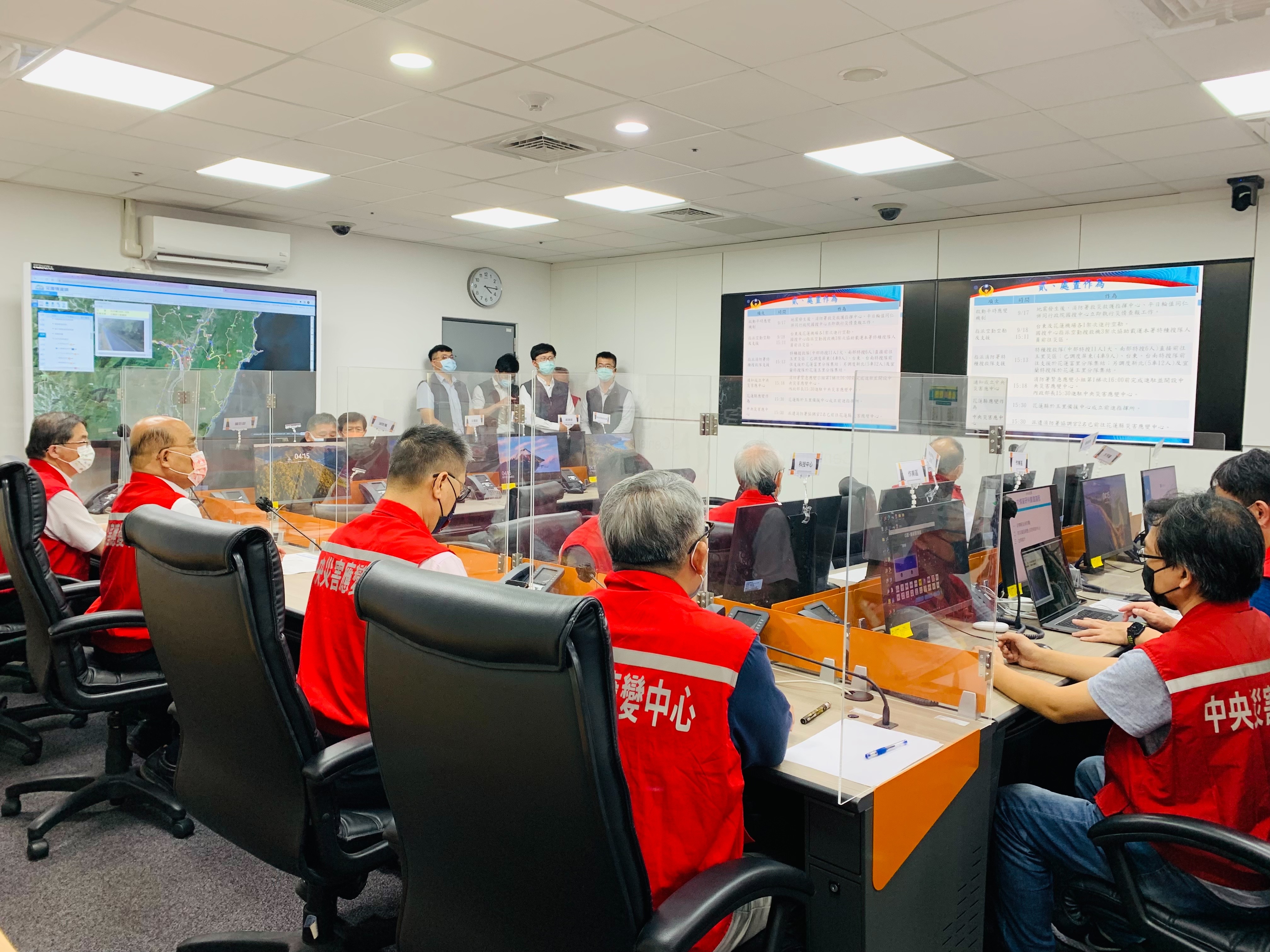 因應花東地震災情,「0918池上地震中央災害應變中心」於今(18)日下午4時一級開設,行政院長蘇貞昌隨即前往應變中心視察,並於晚間8時再度陪同蔡英文總統至應變中心視察,關切災情與救援情形。蘇院長表示,對於救災、醫護、警消等各方人員於第一時間便前往災區現場執行搶救任務,他要表達最大的敬意與感謝,請第一線工作同仁務必留意自身安全,並將災情資訊迅速回報應變中心。此外,蘇院長請各部會針對已發生的災損務必迅速搶救,對於未來可能發生震災的地區或山區,如欲辦理相關大型活動,也請啟動相關預警及預防機制;至於災區所需醫療資源及人力等,也請相關單位預做規劃安排,並設法安撫受困民眾和災民的情緒,同時協助地方政府善盡後續照護工作,給予受災民眾最大的照顧,中央將全力支持相關所需經費。