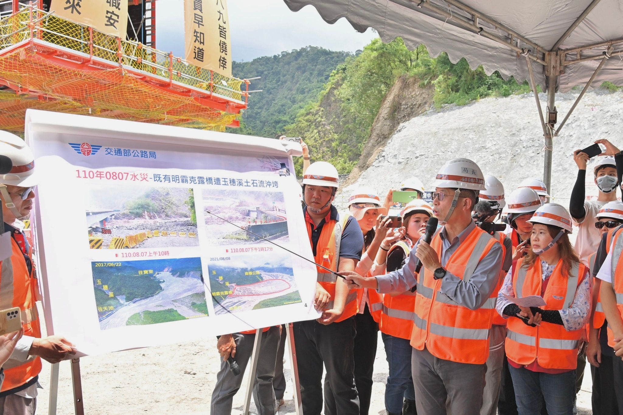隨後,卓院長前往明霸克露橋視察災損及後續復原情形,並聽取交通部公路局陳文瑞局長簡報說明災損情形及搶通策略。卓院長於致詞時表示,明霸克露橋是部落的「希望之橋」,因此工程人員正努力施工搶救中,請同仁務必以安全為第一要務。卓院長進一步說,依據陳局長簡報資料,相關單位已於7月30日搶通台20臨105線梅山口以上至臺東初來的便道,完成第一階段任務;第二階段預計在8月17日完成河床便道打設,提供基本小型車通行需求及南橫公路復建工作;第三階段則預計在10月15日前修復受損的現有玉穗溪口鋼便橋。卓院長強調,第二、三階段工作一定要如期完成,未來修復工程也將視地形安全,持續推動提升當地道路安全。
