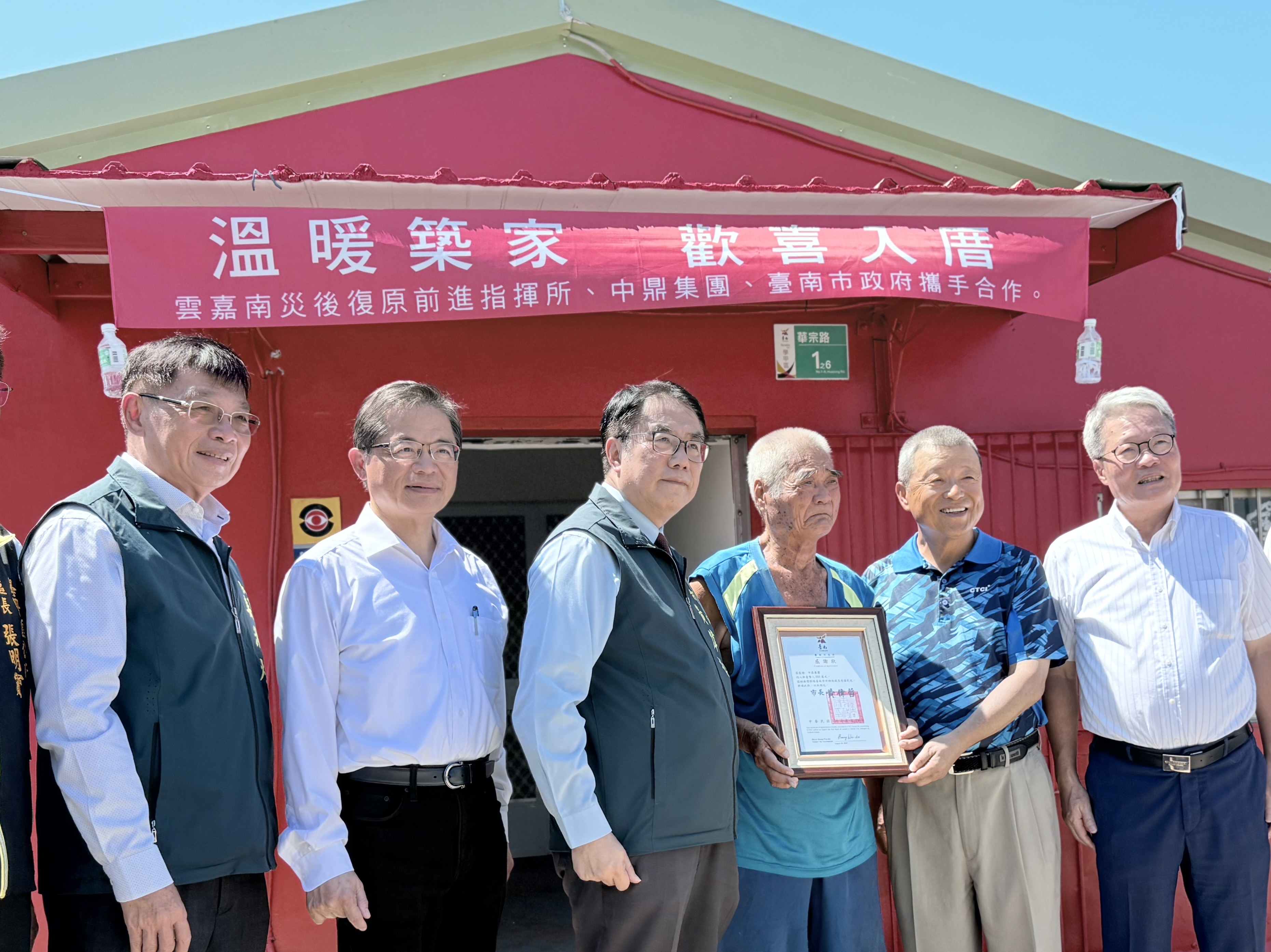 在入厝儀式上,前進指揮所指揮官陳金德、臺南市長黃偉哲及中鼎集團總裁余俊彥共同出席,不僅致贈入厝禮並慰問屋主,關心後續生活所需,也特別向辛苦施工的工班表達感謝。除了市府準備入厝禮表達祝福外,經濟部也協調家電業者捐贈生活家電,由業者直接配送到府,協助災民逐步恢復正常生活。