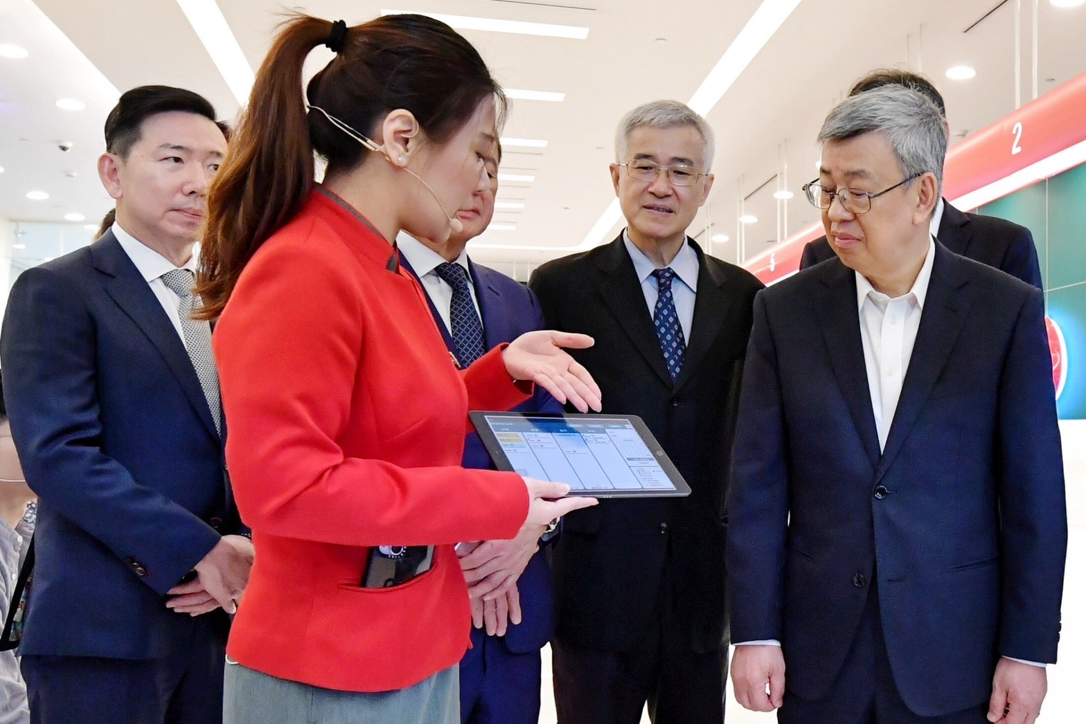 陳院長到場後,首先聽取金管會銀行局童政彰副局長說明「新世代打詐行動綱領1.5版 金融業阻詐識詐工作成效」簡報,並於致詞結束後,由中國信託商業銀行蕭重建副總及李雅婷副總引導說明,分別視察該銀行「神盾聯防」4大機制,包含「迎賓識詐」,透過AI智能風險標籤偵測異常交易,並關注客戶來行行為;「大廳堵詐」,藉由KYC(Know Your Customer)關懷客戶需求,有異常狀況立刻進行聯行通報;「櫃檯阻詐」,臨櫃關懷客戶提高警覺,並持續進行行員識詐訓練;「聯防懲詐」,透過與警政署合作智能ATM,一旦出現異常交易,將觸動連線警局。本次視察也特別安排模擬詐騙車手透過智能ATM領錢,觸動警局連線,由南港分局員警制服情境,顯示上述4大機制,已充分發揮「識詐、堵詐、阻詐、懲詐」功能。隨後,院長與行政院林子倫發言人、打擊詐欺辦公室李憲明主任、金管會黃天牧主任委員、銀行局莊琇媛局長、證券期貨局張振山局長、臺北市政府警察局南港分局王炳睿分局長、中國信託商業銀行利明献董事長、中國信託育樂股份有限公司陳國恩董事長等人合影留念。