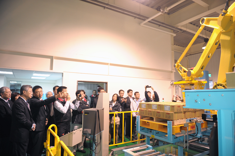 為鼓勵根留臺灣、深耕臺灣,且具有開發設計及追求創新的企業,陳院長稍後前往位於臺中市工業區的「振鋒企業股份有限公司」,實地參觀該公司自動化倉儲系統、組裝生產線及自動化包裝機械臂作業情形,並期許該公司持續朝注入科技、環保、綠能等元素的方向永續經營。