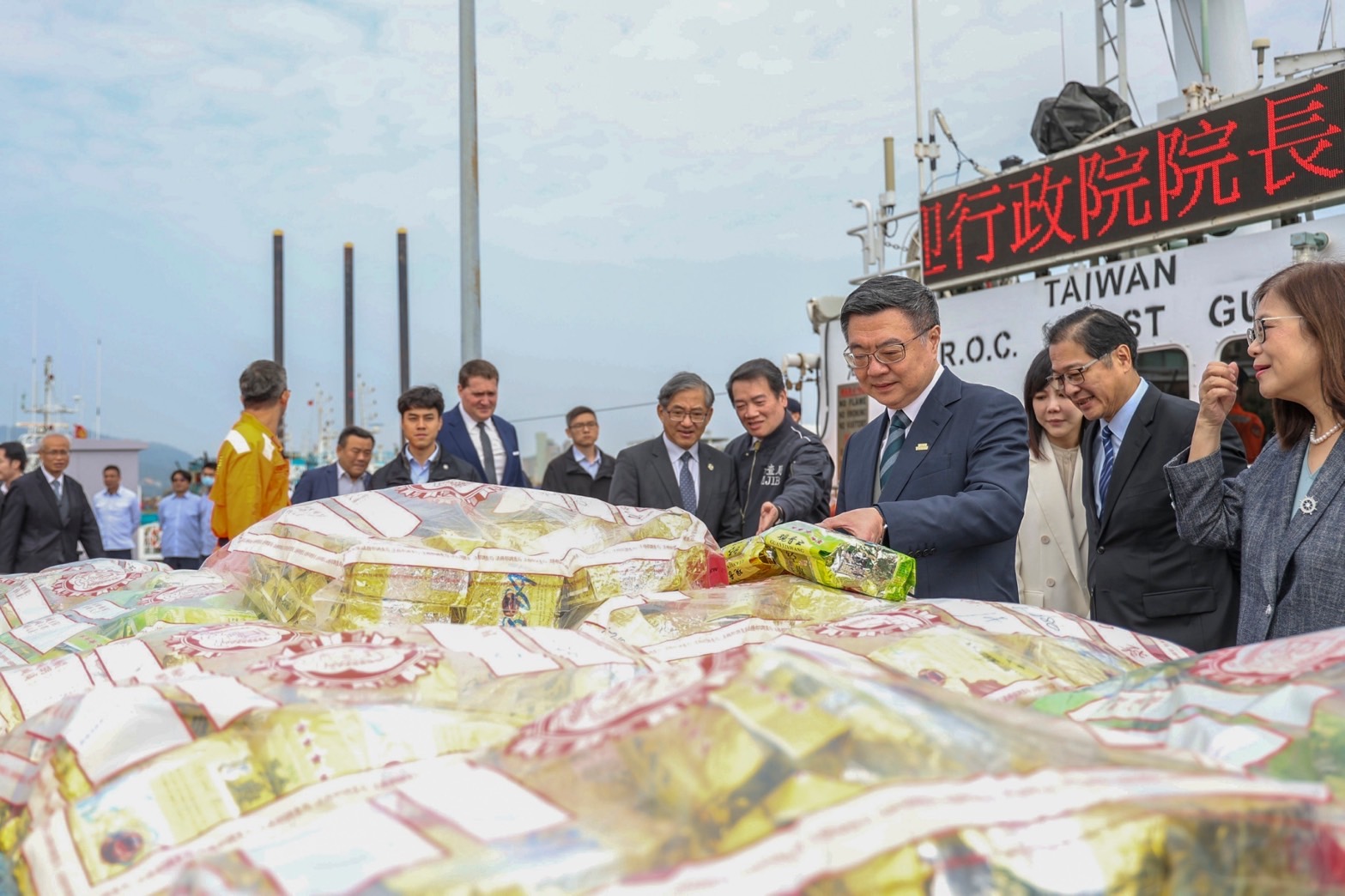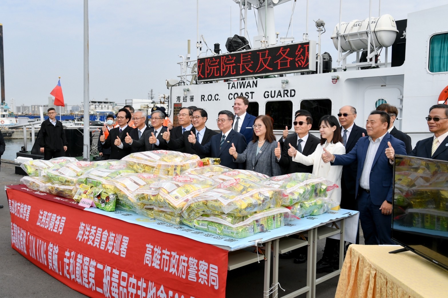 隨後,卓院長與行政院李慧芝發言人、法務部鄭銘謙部長、海洋委員會管碧玲主任委員、最高檢察署邢泰釗檢察總長、臺灣高等檢察署張斗輝檢察長、高雄檢查分署朱家崎檢察長、臺灣高雄地方檢察署洪信旭檢察長、調查局陳白立局長、海委會海巡署張忠龍署長、美國在臺協會(AIT)高雄分處張子霖(Neil H. Gibson)處長等人,共同視導扣案毒品證物。卓院長也與現場緝毒有功人員逐一握手,感謝他們的付出。