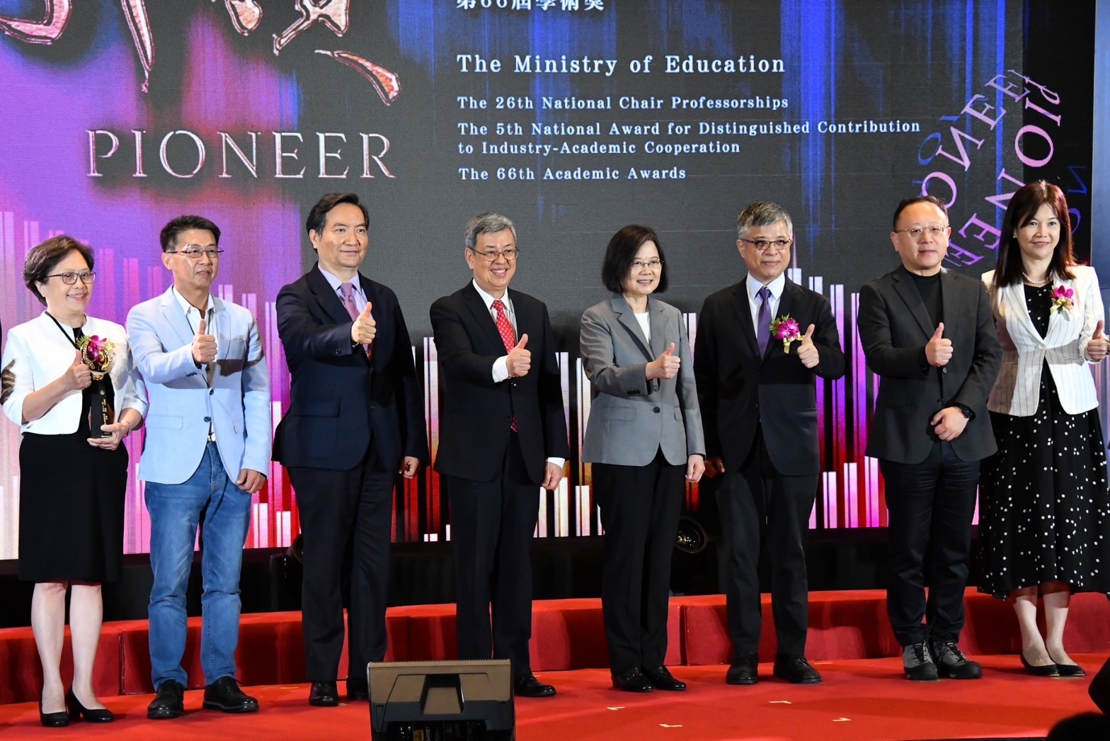 最後,陳院長表示,很開心今日能與學術界朋友共聚一堂,也感謝所有得獎者願意栽培後進,成為國家未來研究的主力,所謂「獨行者速,群行者遠」,一個人走路可以走得很快,但是大家一起走,可以走得更遠,並祝福所有得獎者在學術研究上能有更好的突破。此次頒獎典禮,由蔡總統頒發「國家講座主持人獎」(5位)及「國家產學大師獎」(2位);陳院長頒發「學術獎」(14位),肯定得獎人在學術領域的傑出貢獻,並逐一與得獎人及其親友合影留念。