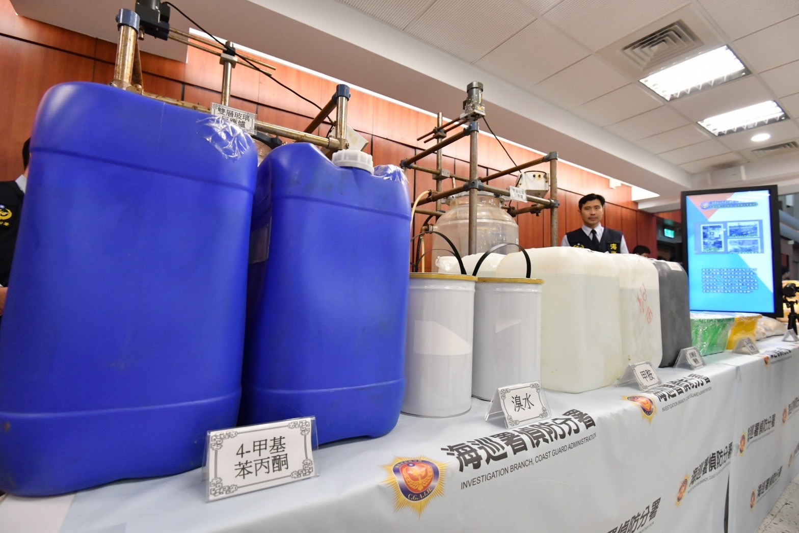 此行,陳院長首先聽取臺灣高等檢察署林秀敏檢察官簡報「安居緝毒專案」第8波執行成果,隨後視察重大查緝成果展示,包括偵破走私大麻花共計491公斤,市值7.3億元;截獲遊艇走私愷他命及安非他命逾1公噸,市值約10億元;查獲走私安非他命312公斤並溯源查獲先驅原料98公斤、攔截走私愷他命270公斤、查獲走私製造喵喵先驅原料545公斤,並破獲兩起「喵喵」製毒工廠,分別查扣第三級毒品及先驅原料60餘公斤及成品、半成品近700公斤。致詞結束後,陳院長也與法務部調查局、財政部關務署、內政部警政署刑事警察局、海洋委員會海巡署等查緝有功單位人員合影留念。