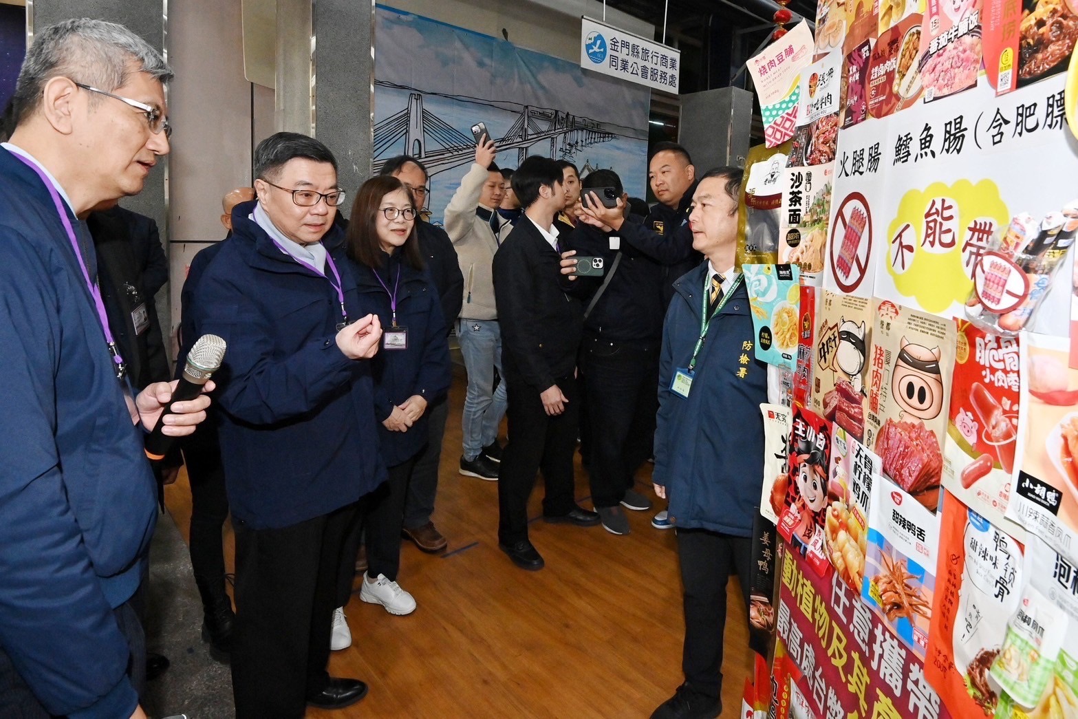 隨後,卓院長在交通部林國顯次長及相關人員陪同下,前往視察「小三通及金門水頭商港旅客服務中心」,聽取交通部航港局葉協隆局長說明「金門商港水頭港區」簡報,了解水頭港大型旅客服務中心新建工程、金門小三通航線營運現況及春節疏運措施等。葉局長指出,水頭港客運中心將於今(2025)年8月完工、10月啟用,可望成為國內最具規模的海運客運場站。此外,金門小三通航線自2020年受新冠疫情影響停航,至2023年復航,航班數量也隨旅客身分放寬而增加;春節期間,預計尖峰時段將集中於連假前1日至小年夜下午,以及連假末3日,航港局已會同CIQS預排人力因應,並持續阻絕非洲豬瘟於境外,落實船舶廚餘、肉製品禁止入境等防疫工作。