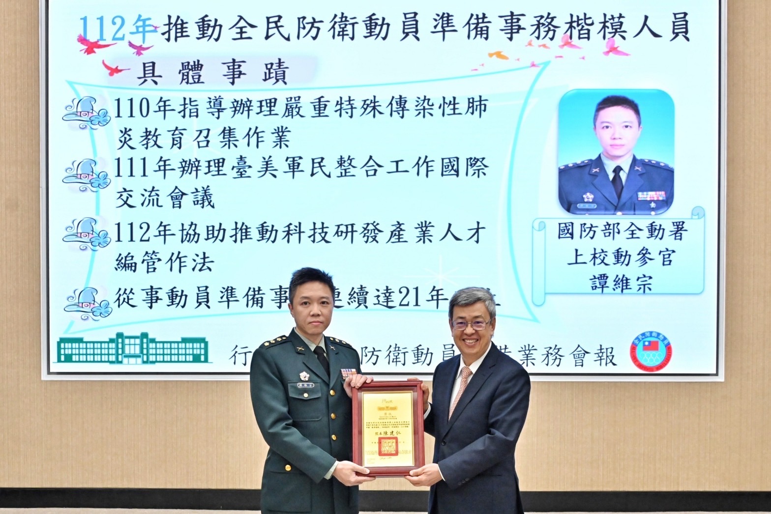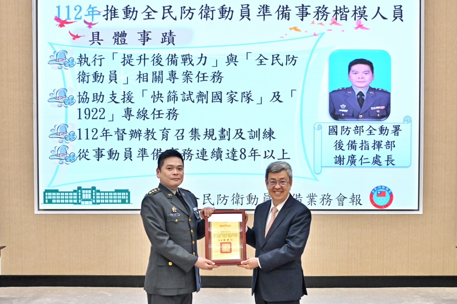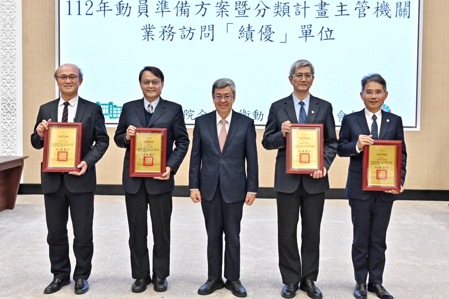 陳院長於會前首先觀賞全民動員紀實影片,並頒獎表揚112年度全民防衛動員暨災害防救(民安9號)演習兵棋推演及綜合實作「特優」單位、軍民聯合防空(萬安46號)演習「特優」單位、動員方案暨分類計畫主管機關業務訪問「績優」單位、協助全民防衛動員準備事務有功單位,以及推動全民防衛動員準備事務模楷人員等,並與受獎代表合影留念。