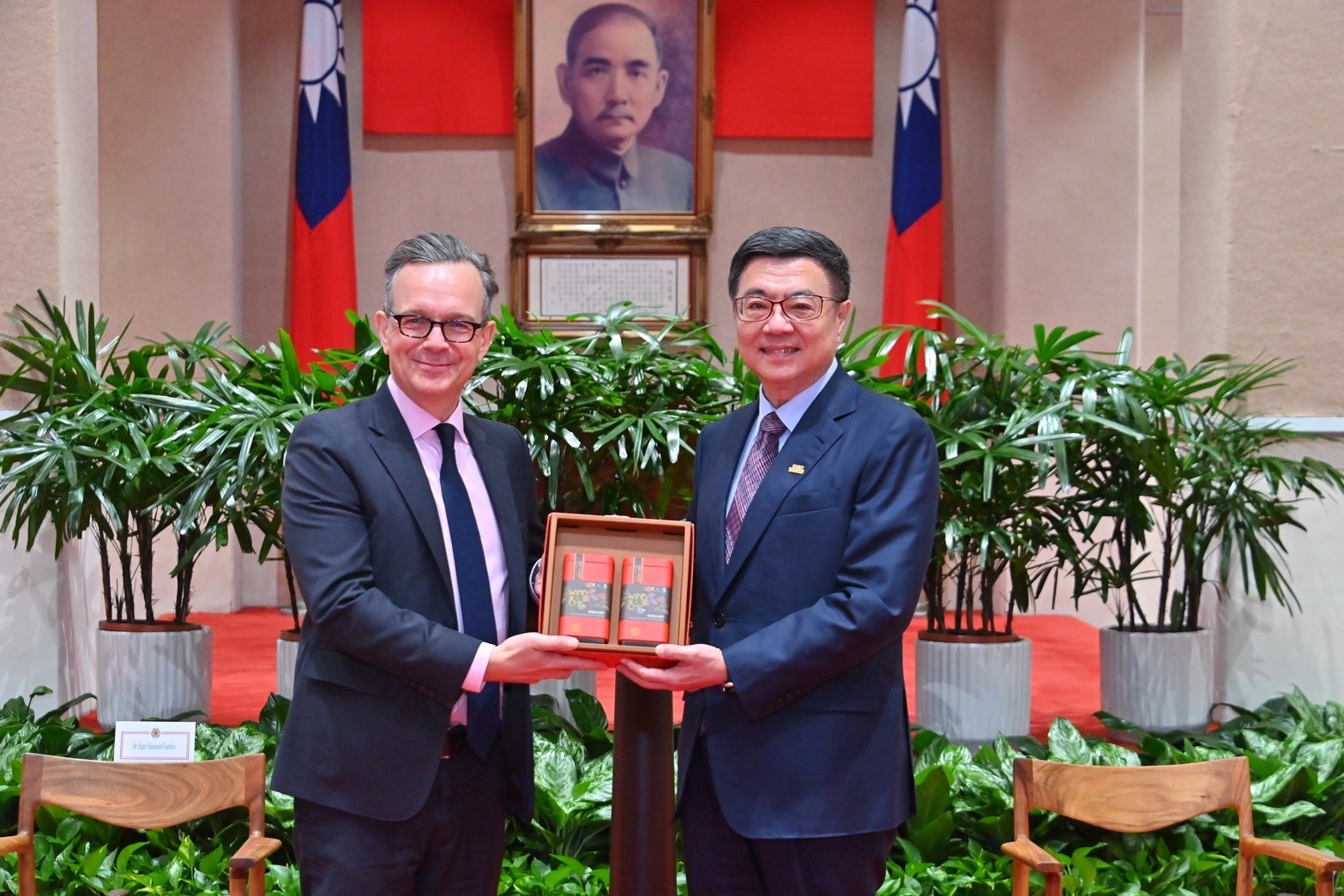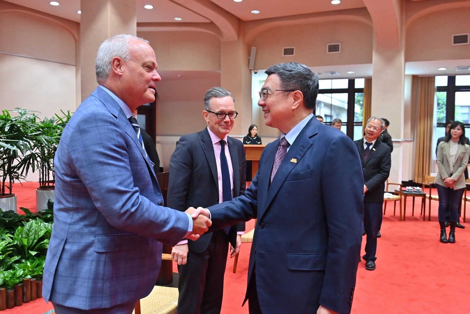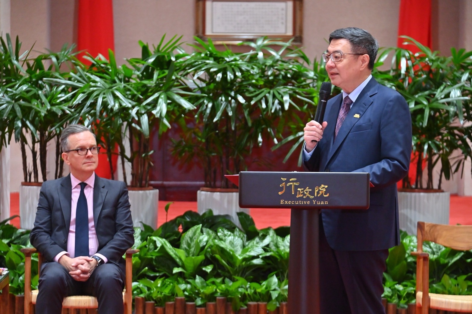 訪賓一行由外交部陳立國次長陪同,前來行政院拜會卓院長,包括行政院龔明鑫秘書長、楊珍妮政委、李慧芝發言人、經濟部何晉滄次長、衛生福利部周志浩次長等也在座。