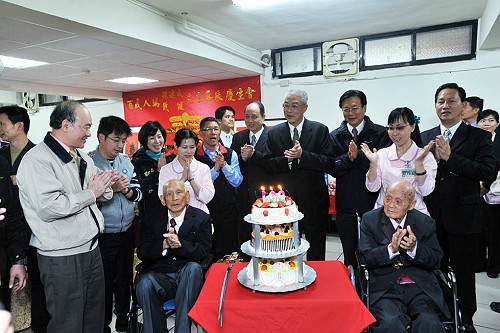吳院長稍後轉往彰化榮民之家訪視,在退輔會主委曾金陵及彰化縣長卓伯源陪同下,訪視榮家各項安養設施,並與榮民共進午餐提前賀春節,同時院長也代表馬總統,致贈百歲榮民孫連成及戴健壽屏,轉達總統的關懷及祝福之意。