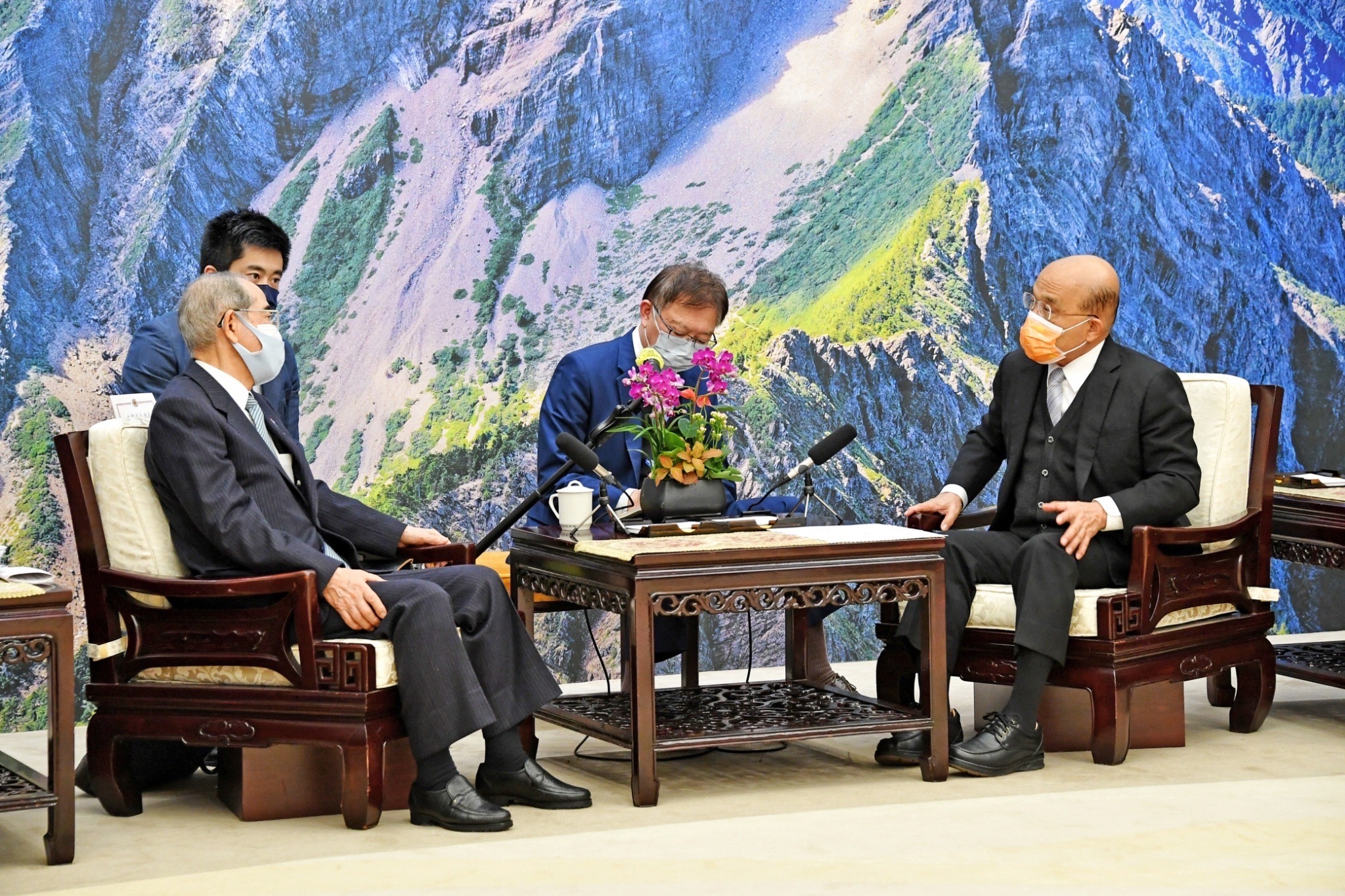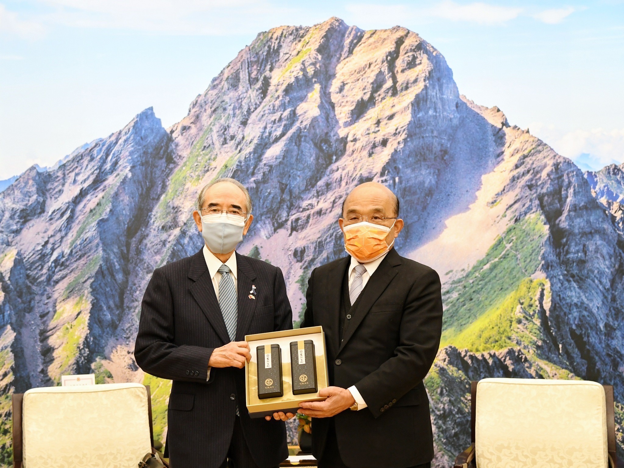 此行訪團成員另包括:日本台灣交流協會東京本部總務部長花井郁子、台北事務所代表泉裕泰、主任長田洋司及山田佑。我方則由行政院政務委員兼發言人羅秉成、政務委員黃致達、外交部長吳釗燮及臺灣日本關係協會秘書長周學佑等陪同。此行蘇院長致贈大橋光夫會長「極選籟狸尖山散茶禮盒」、致贈花井郁子部長「好事壺組 一壺+二杯」,雙方並合影留念。
