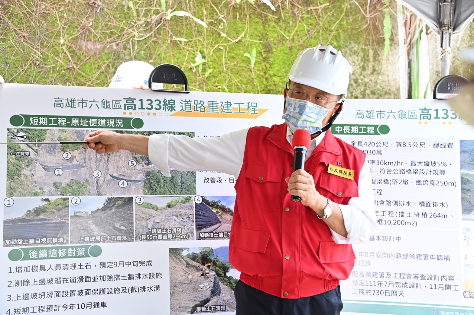 蘇院長稍早至高雄市六龜區視察「高133線道路重建工程」時表示,高133線道自寶來至新發,因道路中斷,致使兩地無法交通往來,影響地方產業甚鉅,因此要從穩定地質及做好工法以解決該區域山坡地土質不夠穩定及雨水沖刷的問題。