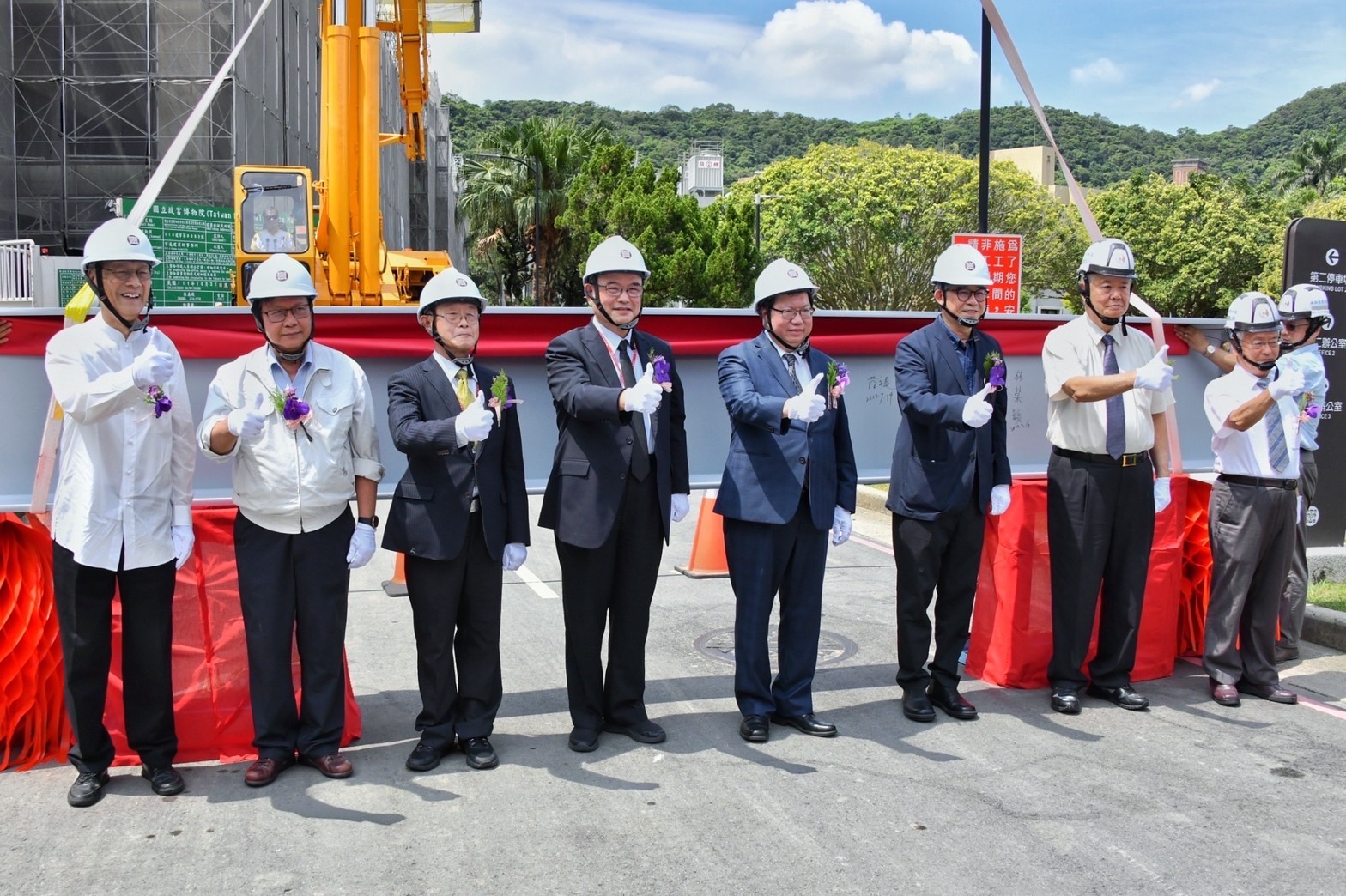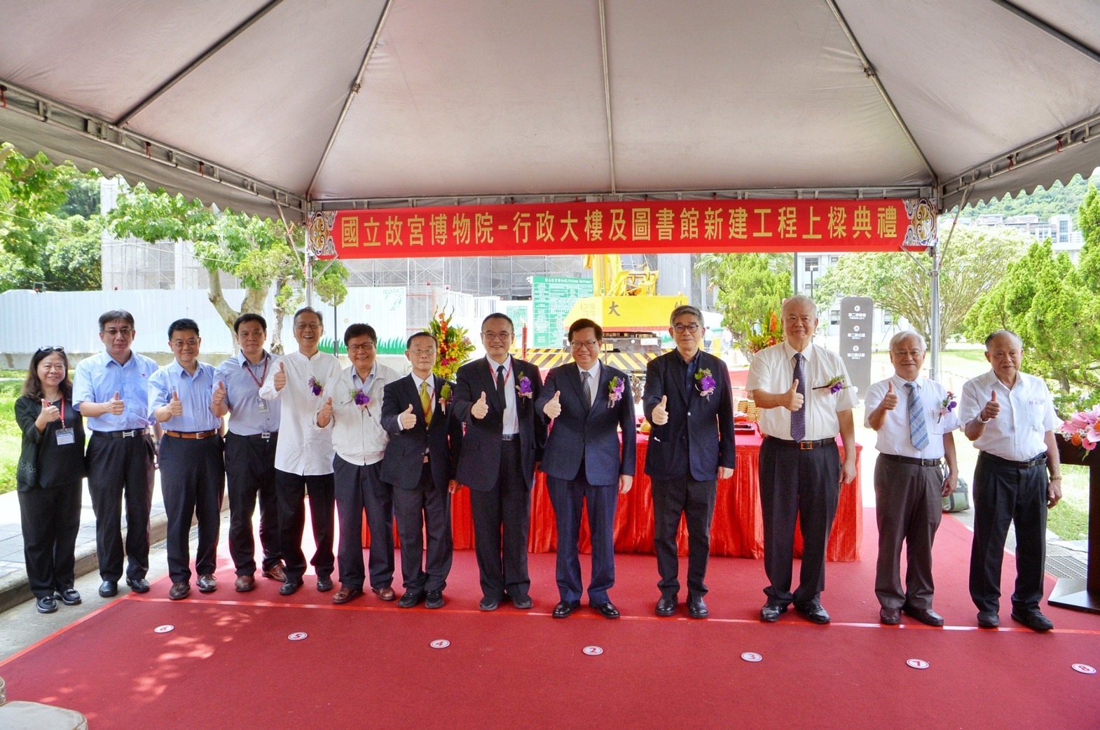 此行,鄭副院長到場後,首先聽取故宮秘書室營繕科王欣榮科長簡報「新故宮計畫-故宮北部院區整(擴)建計畫」以及觀看工程模型。致詞結束後,由鄭副院長擔任主祭官進行祈福祝禱儀式,上香祈求庇佑樑柱穩固、工程順利圓滿,隨後與故宮蕭宗煌院長、黃永泰副院長等嘉賓共同為福樑安裝金螺栓及簽名,福樑並在鳴炮聲中緩緩上升安裝,完成上樑儀式。