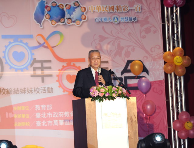 行政院長吳敦義今(29)日出席「建國百年,百年好合-見證百組同名學校締結姐妹校」活動時表示,這是一個令人溫馨而感動的盛會,每一組同名的學校,當中會有一種很特殊情感的連結,彼此關心,當需要交流及相互支援時,便能發揮出很大的力量,如八八水災重建時,就有台北市的學校對災區的姐妹校施予援手的例子。