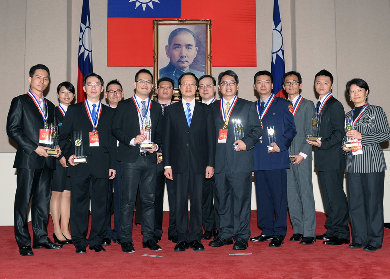 稍後,江院長頒授青年獎章、獎座,計有稻江科技暨管理學院專技助理教授呂哲維、臺中地方法院檢察署檢察官吳錦龍、工業技術研究院創意中心技術總監林倉亙等12位受獎人,並與百餘位優秀青年代表合影。