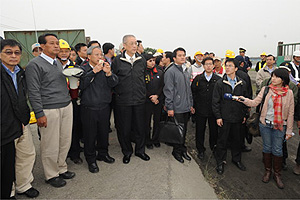 吳院長表示,由於莫拉克風災造成屏東林邊、佳冬地區魚塭淤泥污染嚴重,國軍不眠不休開採砂石回填魚池,協助漁民改善養殖環境,儘速回復地區養殖生產機能,並兼負林邊溪疏濬工作,非常辛勞並表現良好。院長也說,林邊鐵路橋復建工程經由鐵路局同仁的努力,比預定的工程進度提早完工,讓南迴鐵路能夠在明年1月1日恢復正常通車。吳院長並對國軍弟兄及參與相關工程的人員表達敬意與謝意,期望在中央與地方的全力合作下,88水災的重建工作能夠加速完成。