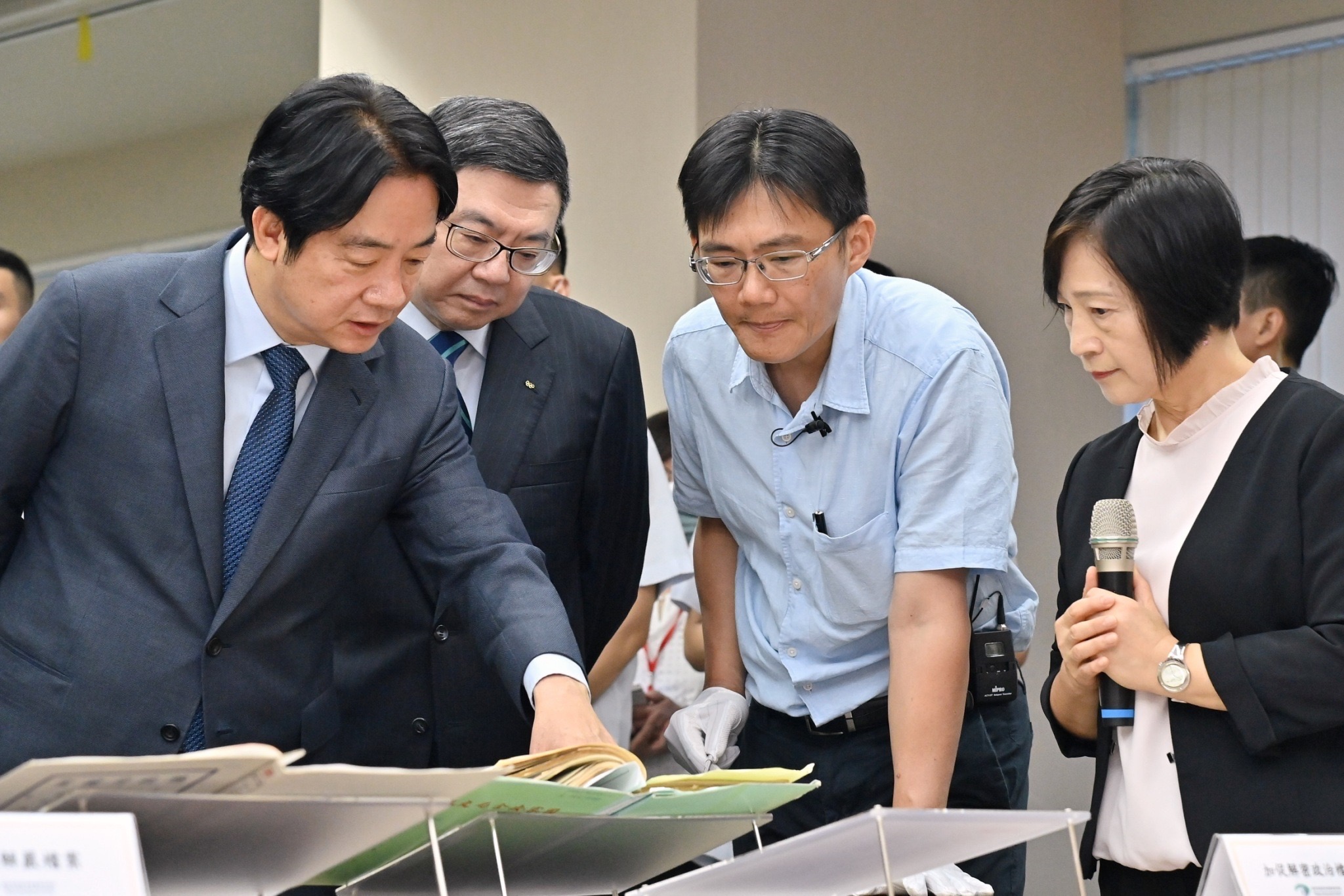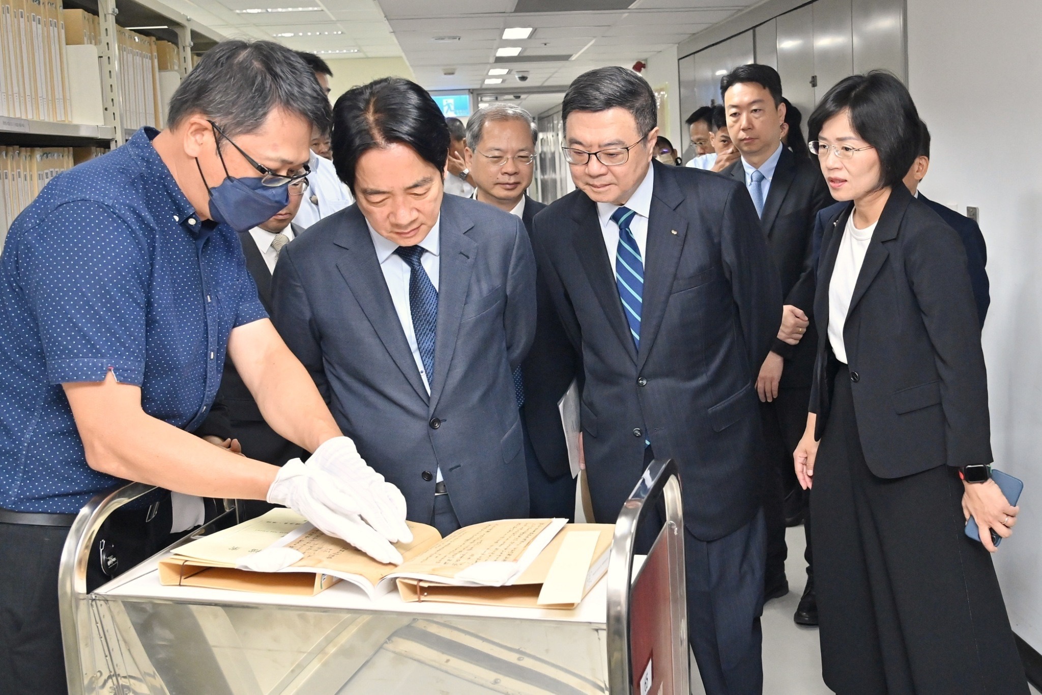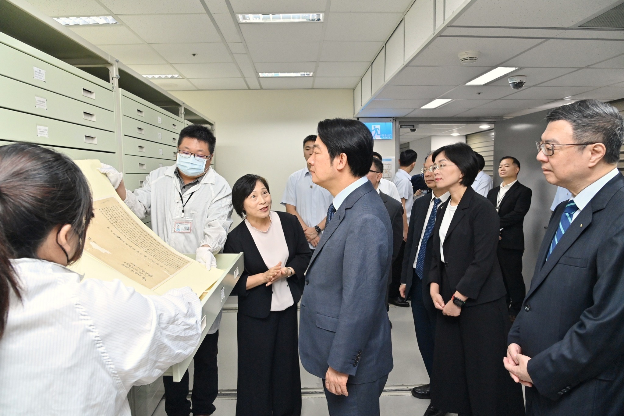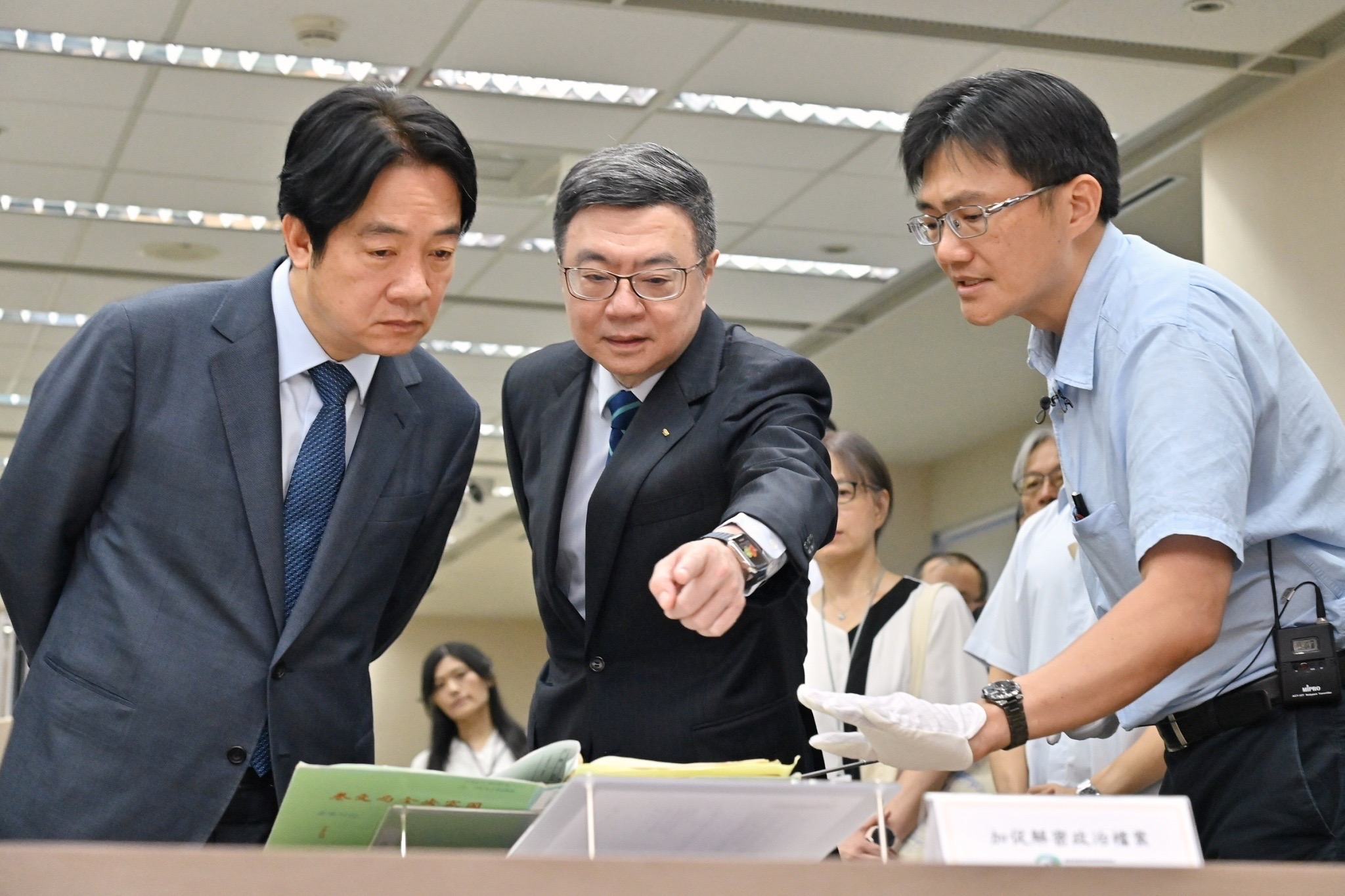致詞結束後,賴總統、卓院長、行政院林明昕政務委員、龔明鑫秘書長、陳世凱發言人、總統府郭雅慧發言人、國家發展委員會劉鏡清主委、蘇巧慧立法委員、檔案管理局林秋燕局長等人視察國家檔案庫房典藏政治檔案環境,由蔡昇璋研究員介紹我國年代最早的國家檔案、政治檔案卷宗,並由林局長講解庫房安全管控機制。隨後,一行人接續前往國家檔案閱覽中心,由許峰源研究員說明戒嚴、解嚴及國安法檔案,並於現場展示戒嚴與解嚴令、限制言論集會與新聞自由等相關法令檔案,卓院長也特別感謝檔案管理局同仁對政治檔案開放的辛勞付出。