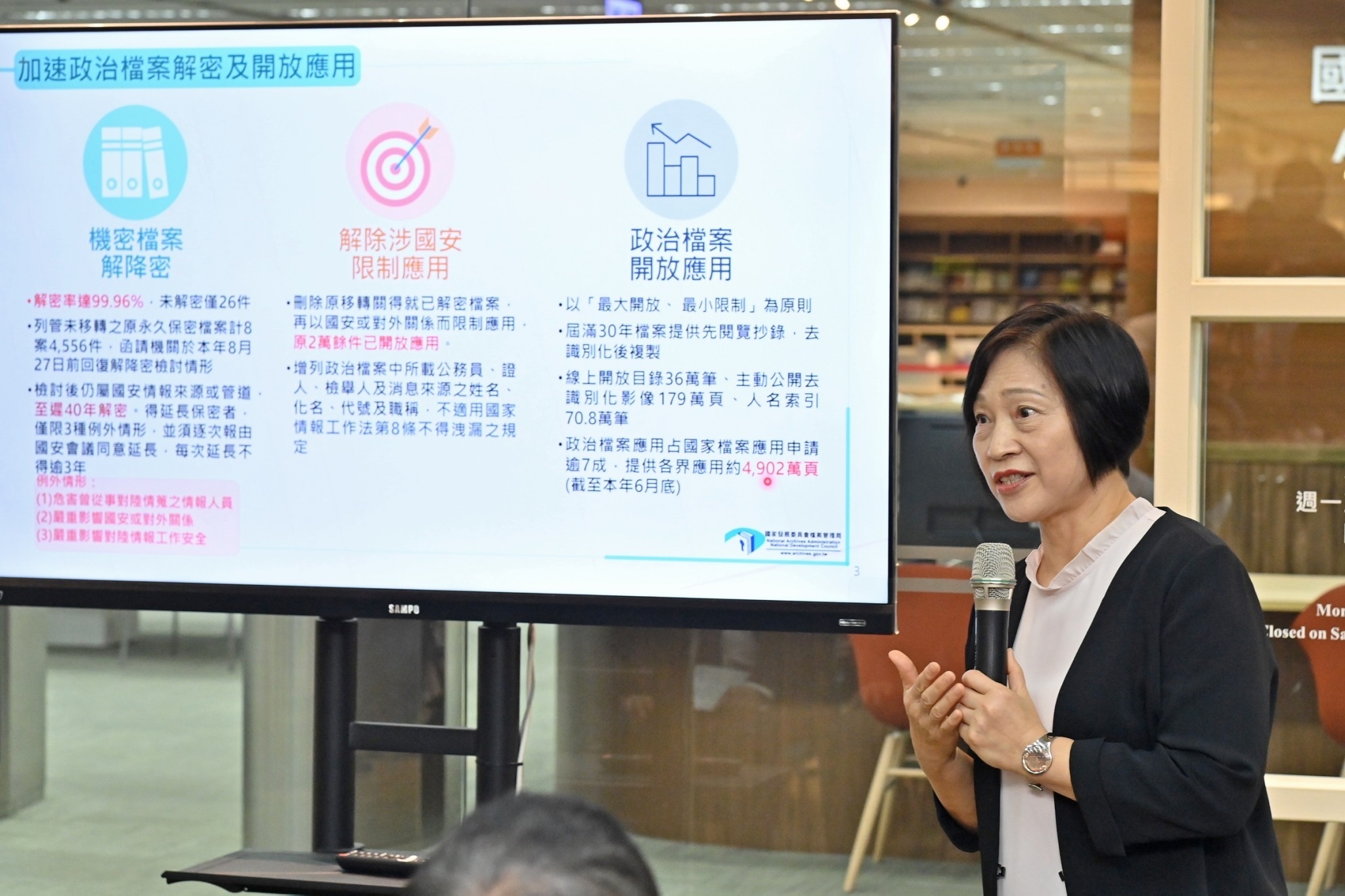 卓院長進一步表示,對於有嚴重影響國家安全或對外關係之虞,而限制應用的檔案,在《政治檔案條例》修法後,已刪除相關限制應用規定;至於監控類檔案,也在修法後建立其開放應用標準,政府將在近期內逐步通知當事人優先閱覽,並依法確保當事人隱私後,再開放社會大眾申請應用,這也展現政府誠實面對歷史真相、積極落實轉型正義的決心。