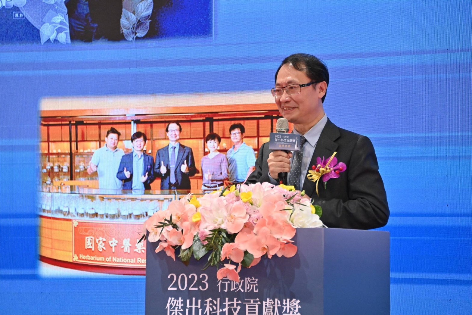 陳院長進一步表示,第3位得獎人中央研究院環境變遷研究中心許晃雄特聘研究員對「氣候變遷的推估與模擬」,建立「臺灣地球系統模式」,為政府因應災害性天氣提供重要依據。院長說,推動「2050淨零排放」目標對臺灣而言是項嚴峻挑戰,需要全體國民與政府一同努力,透過許特聘研究員以科學為基礎的模擬數據,讓民眾了解全球氣候變遷情形,並願意支持政府政策,與政府攜手推動淨零排放工作;最後一位得獎人衛生福利部國家中醫藥研究所蘇奕彰所長帶領團隊研發「臺灣清冠中藥」,在COVID-19疫情關鍵時刻,為眾人帶來防疫安心的力量,也為臺灣中藥發展創下新的里程碑。院長強調,4位傑出科技貢獻獎得獎人在研究過程中,也為國家培養許多優秀人才,而這些人才正是厚積國家科研實力,讓臺灣在科技研究、產業創新等領域持續向前進的關鍵因素。