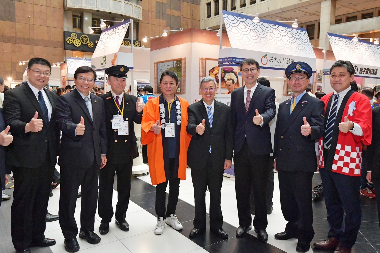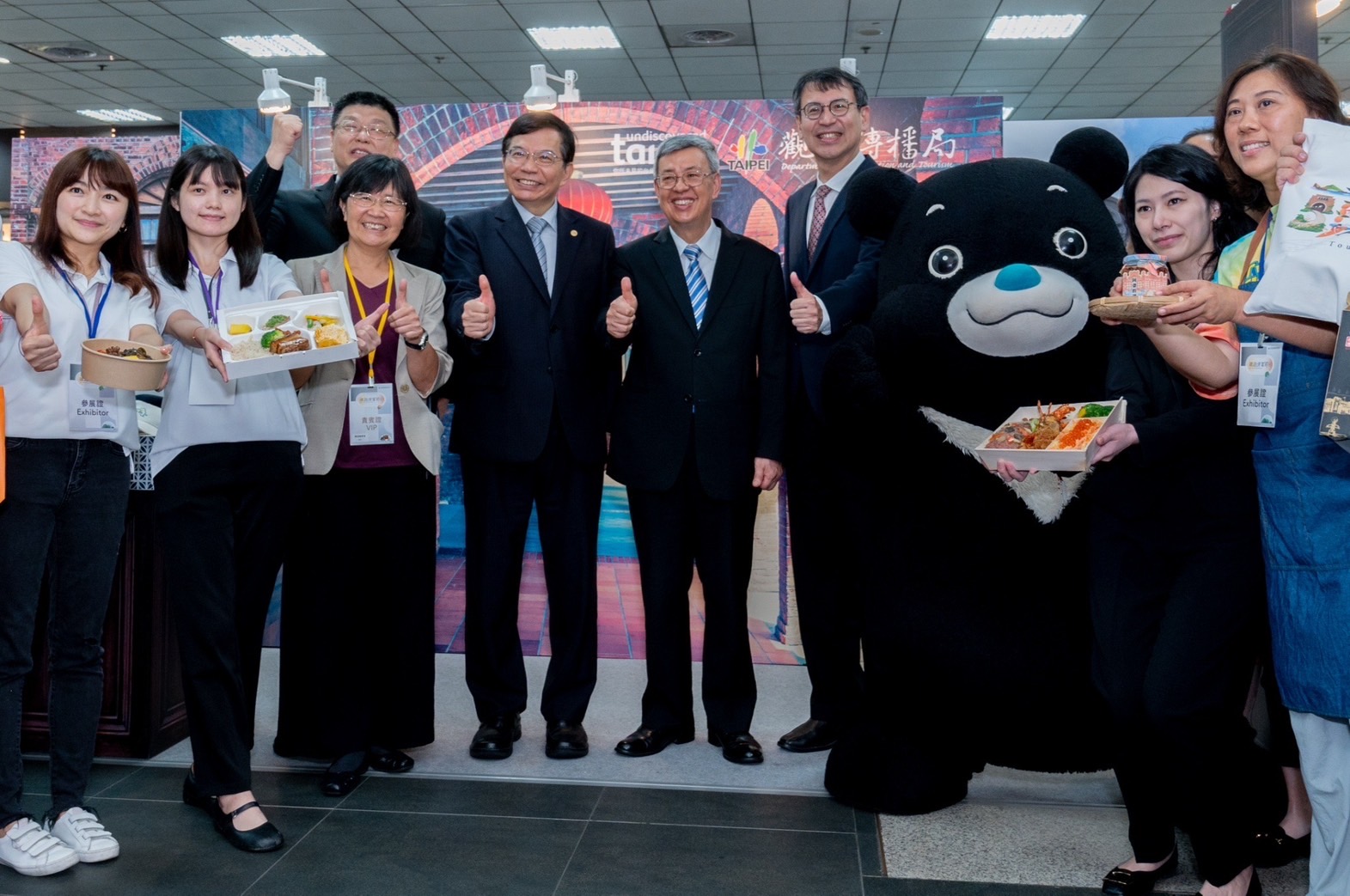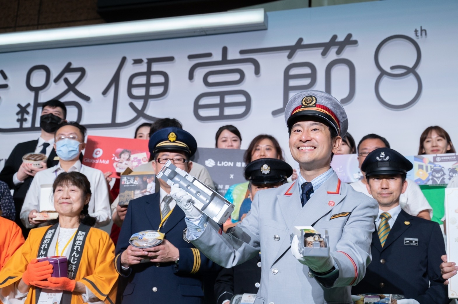 隨後,陳院長與現場貴賓一同欣賞由42家國內外參展業者參與的特色便當開幕走秀,院長也手持「鐵路便當節」手板,與現場貴賓及參展業者合影,並與行政院林子倫發言人、交通部王國材部長及臺灣鐵路管理局杜微局長一同手持搖鈴,為「第8屆鐵路便當節」正式揭開序幕。接續,陳院長參觀禮賓候車室、縣市政府與國際鐵道區等展區,聽取相關介紹,並分別與臺鐵同仁、縣市政府代表及日本、斯里蘭卡業者代表合影留念。