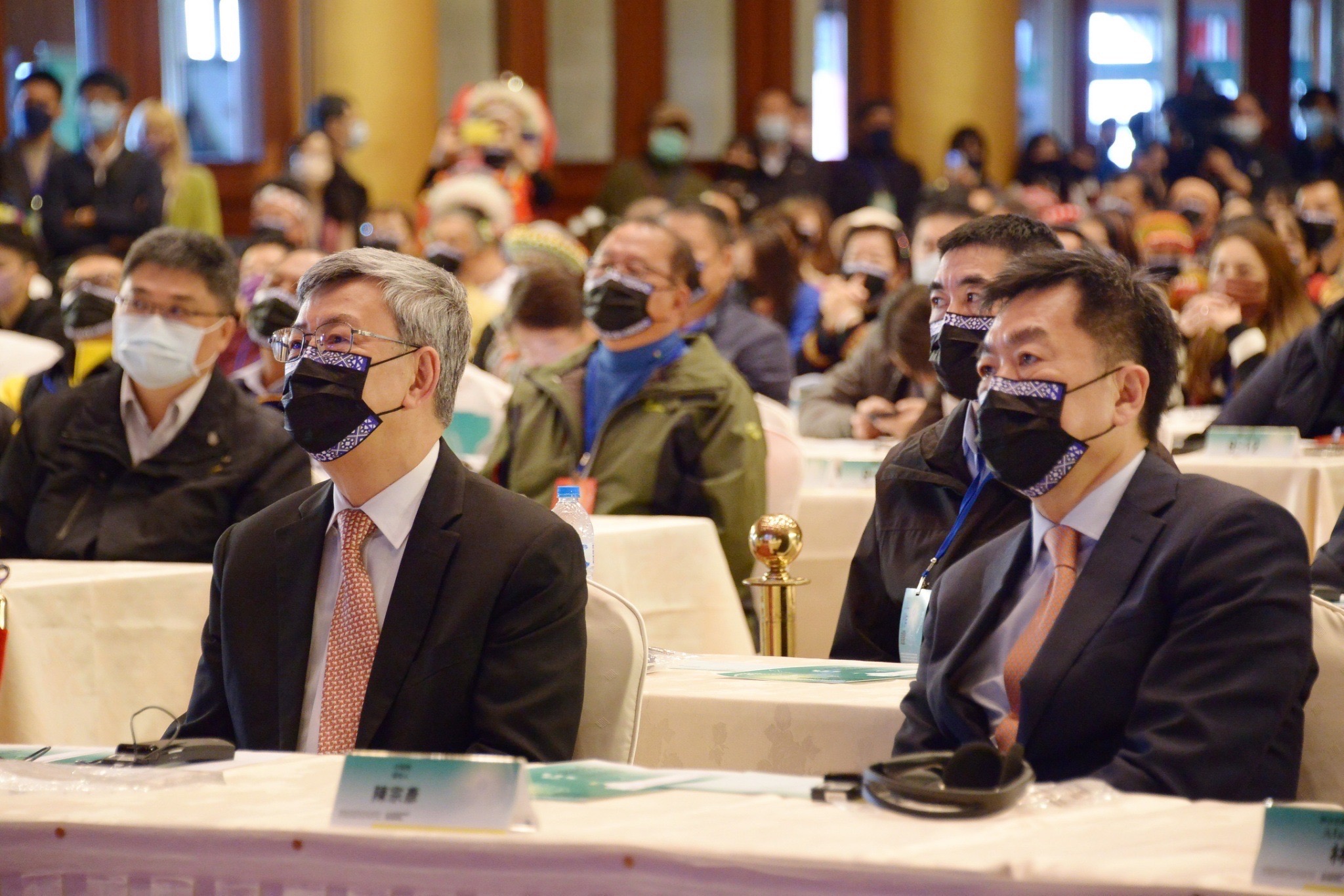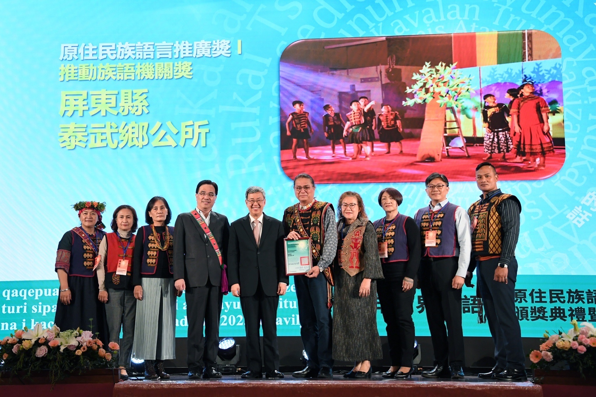 陳院長蒞臨會場後,與賴副總統及現場觀眾在座位上比讚合影,隨後觀看獲獎者影片。陳院長於賴副總統頒獎後,接續頒發原住民族語言教保員獎、語言老師獎、語言推廣人員獎、推動族語公務人員、團體、機關、組織獎,以及特別獎等獎項予13位獲獎代表,並逐一合影留念,場面熱絡。